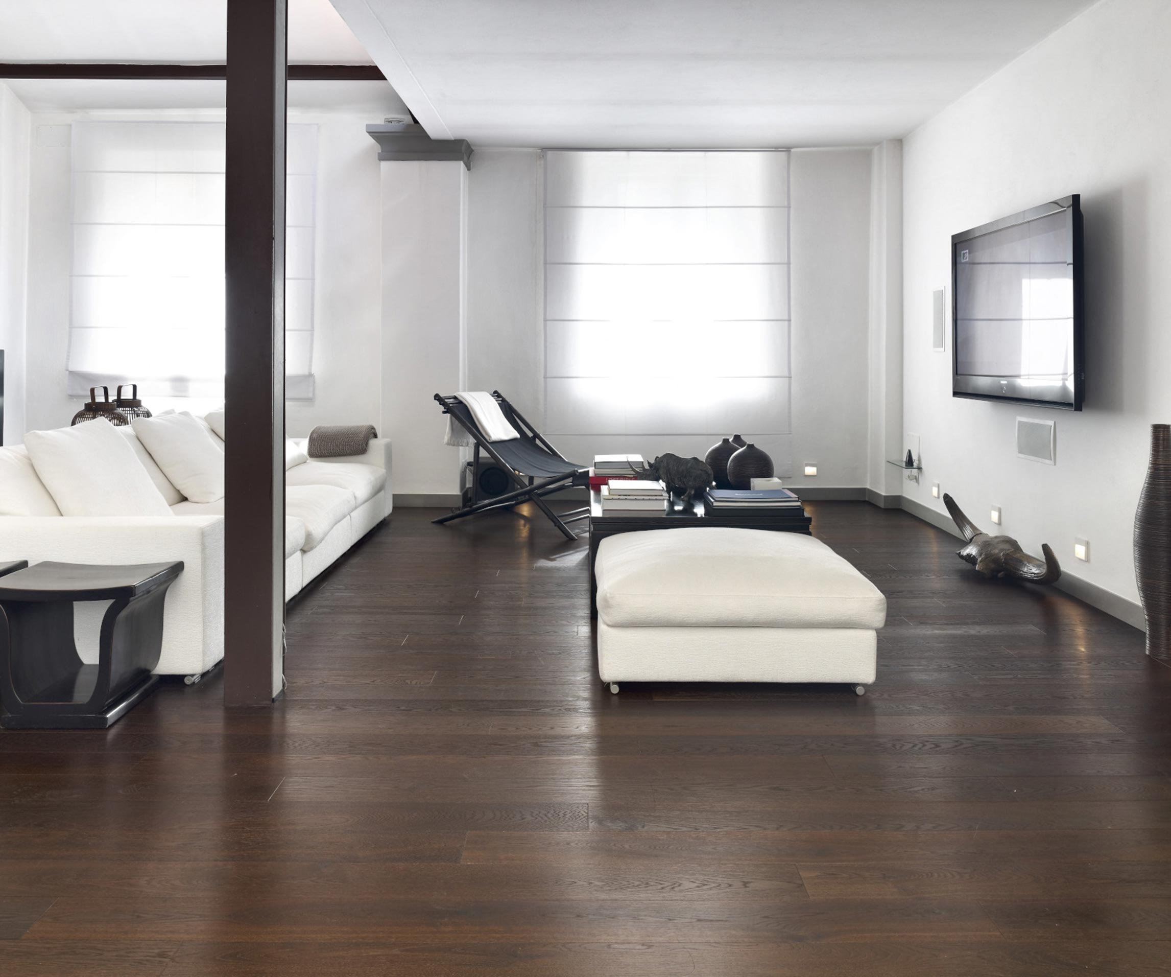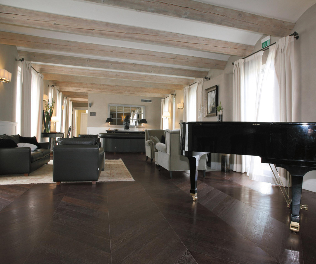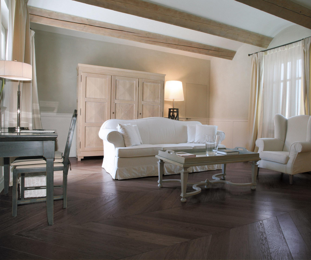 Das Wesen des Holzes bleibt das Gleiche, aber es bekommt durch die Thermobehandlung Thermowood ein neues, einzigartiges und unnachahmliches Licht. Das Holz der oberen Lamelle wird hohen Temperaturen ausgesetzt, die Feuchtigkeit verringert sich dadurch und der Holzzucker in den verschiedenen Holzarten karamellisiert. Dadurch wird die Schicht in der gesamten Stärke dunkler und härter. Das Holz wird resistenter gegen Aufquellen und gewinnt an Dimensionsstabilität. Es bekommt Nuancen erlesenster Ästhetik, warm und intensiv, die von den dunklen Tönen der feuchten Erde bis zur karamellfarbenen Schattierung des Honigs gehen. Alle Dielen erhalten die exclusive Behandlung Fiemme 3000 Bio Plus, die zu 100% biokompatibel ist und die das Holz bis in die Tiefe nährt und schützt, ohne die Poren zu verschließen. Die Kombination der Behandlung mit Bio Plus und Thermowood macht die Luci di Fiemme Böden einzigartig in Schönheit und Haltbarkeit. Sie sind besonders für feuchte oder stark strapazierte Räume geeignet, wie Küchen, Bäder, Showrooms oder Büros sowie auch bei Fußbodenheizung.
