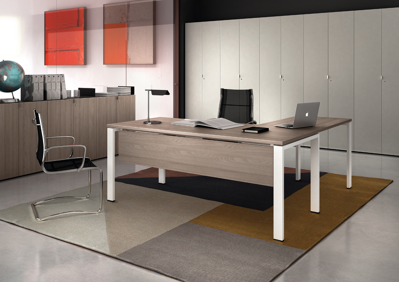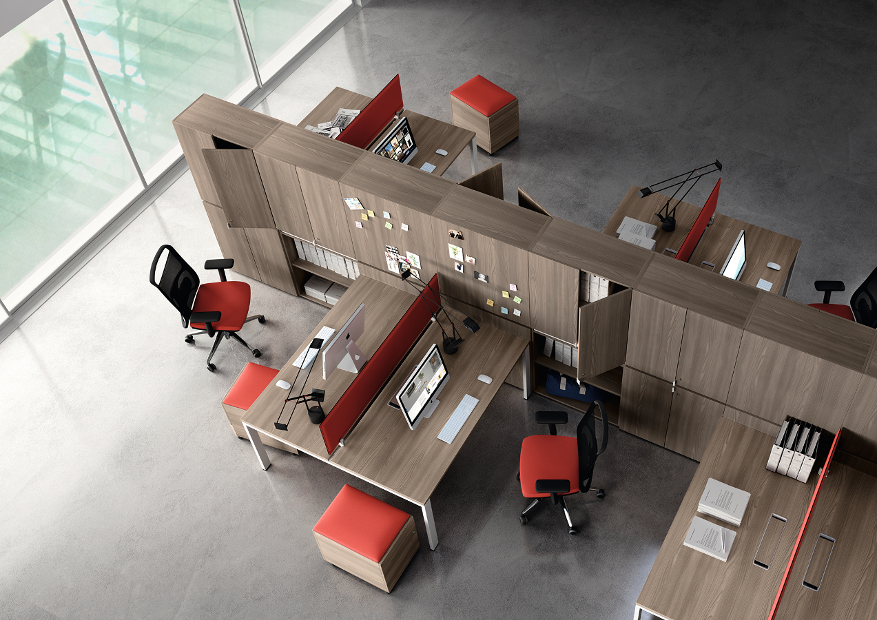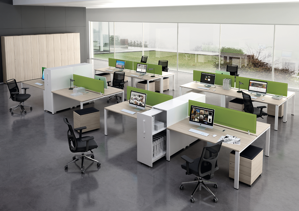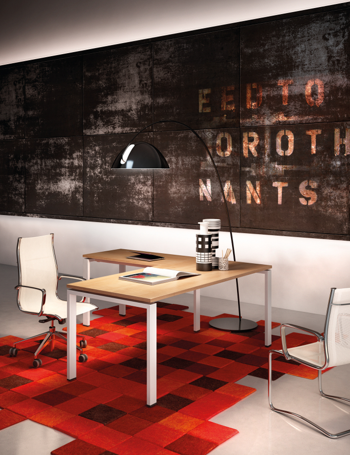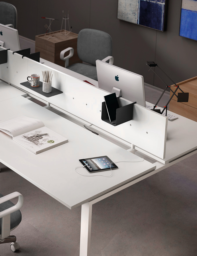 Farben – Arbeitsplatten und Melamonteile: Weiß, Ahorn, Nussbaum, Nussbaum natur und Eiche dunkel – Struktur Beine: weiß oder grau lackiert – Schreibtische Metallzubehör: Anthrazit, Aluminium und Weiß. – Kabelführung: neutrale Farben mit Ausnahme des Eko-Passes und I-Pass-Modelle, die mit dem Flip mit der gleichen Oberfläche wie Melamin erhältlich sind.