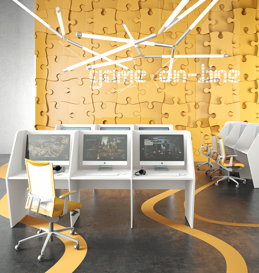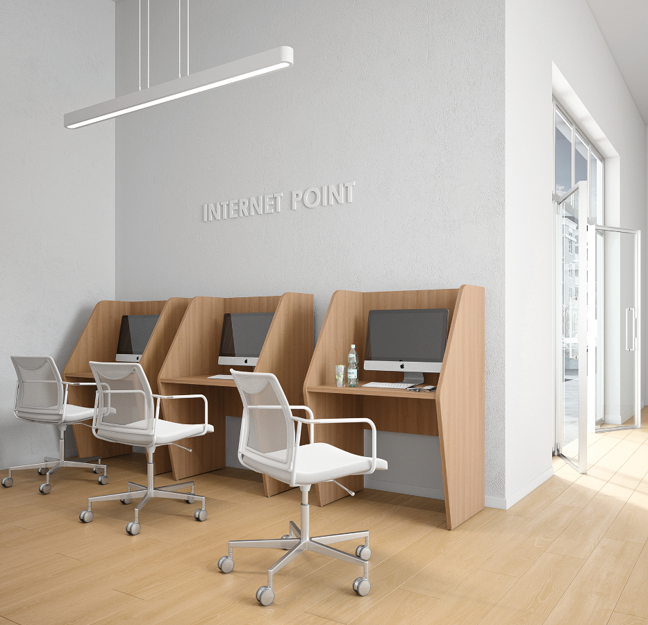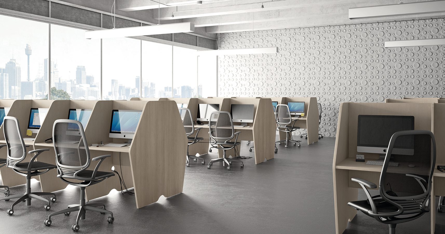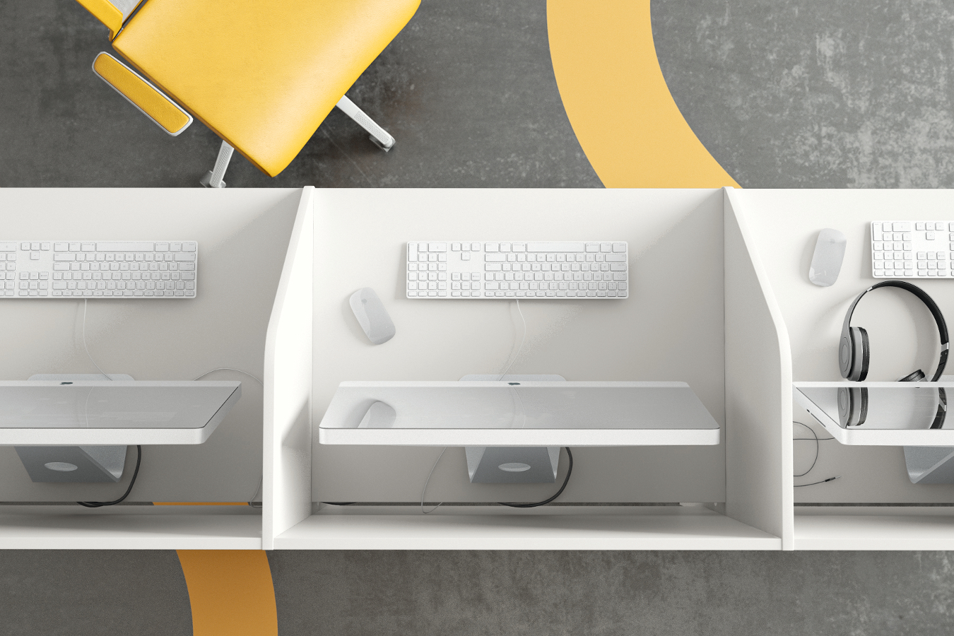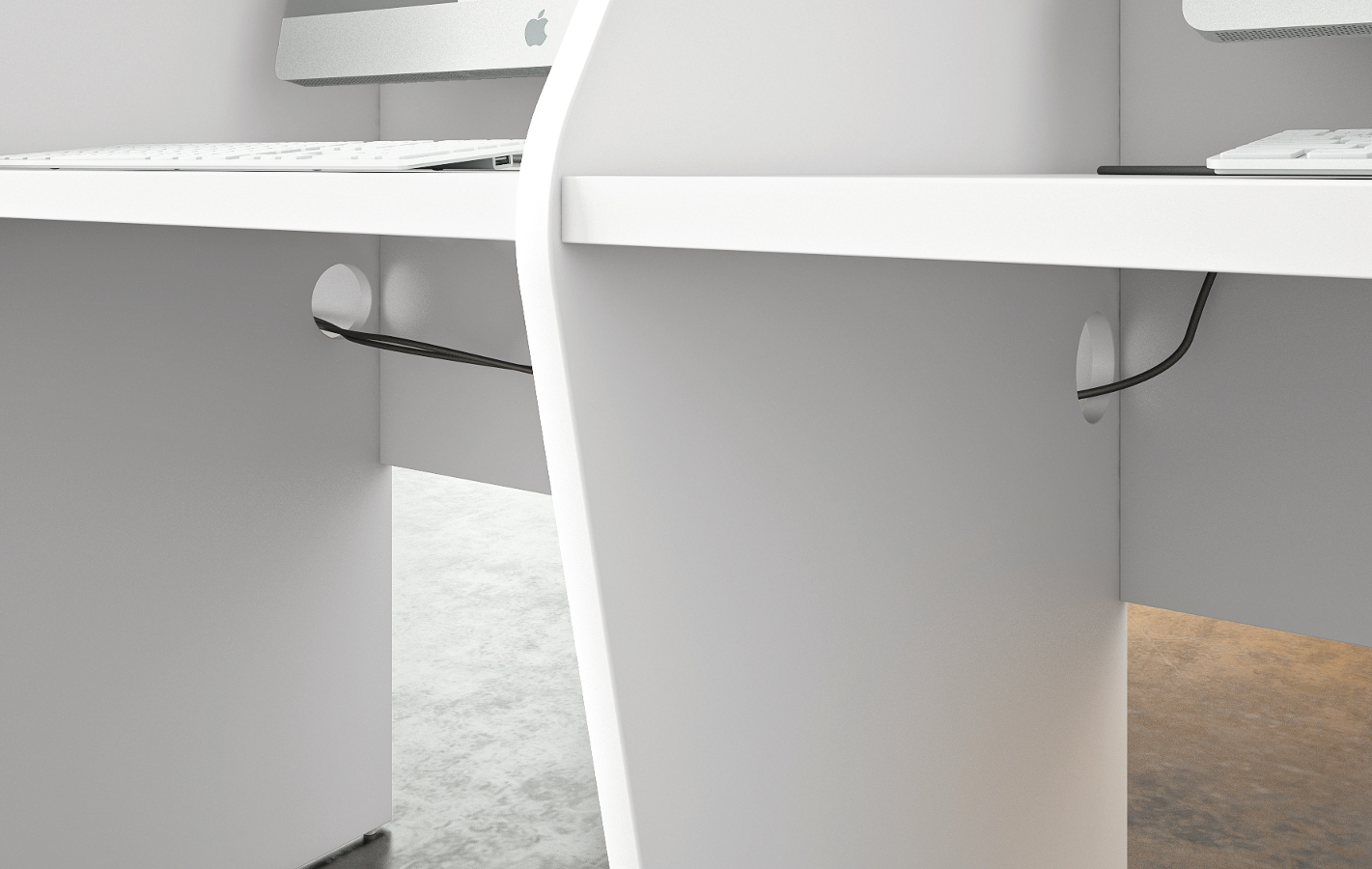 Die Oberseiten sind von der Frontplatte um 4 cm beabstandet, um den Spalt zwischen den zwei Elementen als Kabelkanal zu verwenden. Bei beiden Versionen wird die zentrale Platte, die zwei oder mehr Arbeitsstationen kombiniert, mit einem 8 cm-Loch hergestellt, um eine horizontale Kabeldurchführung zu ermöglichen.