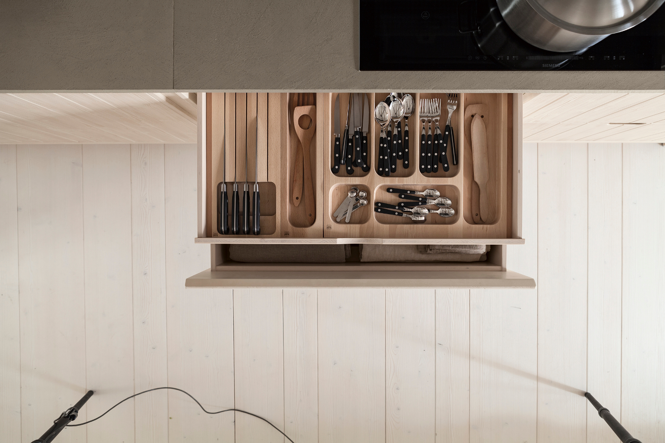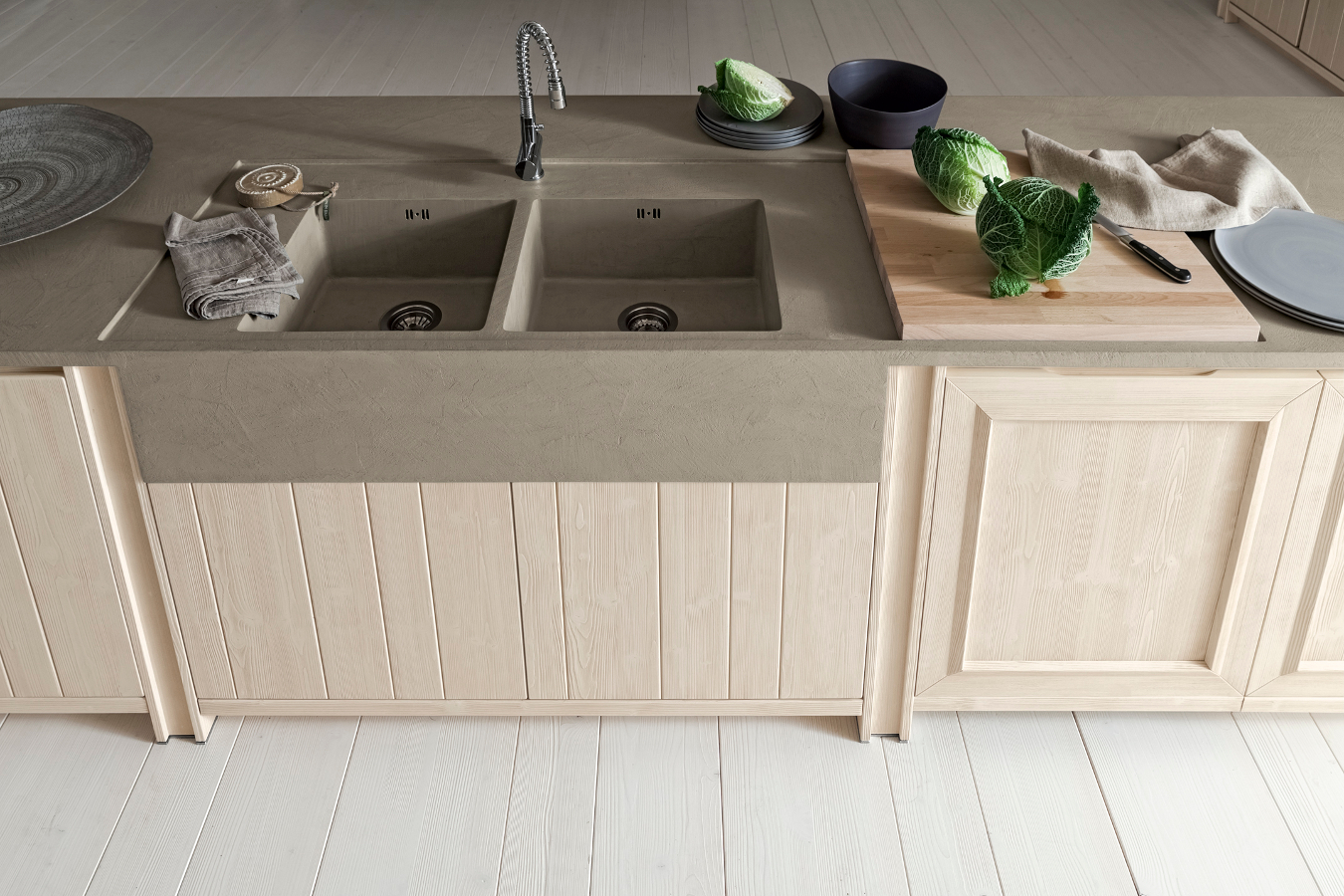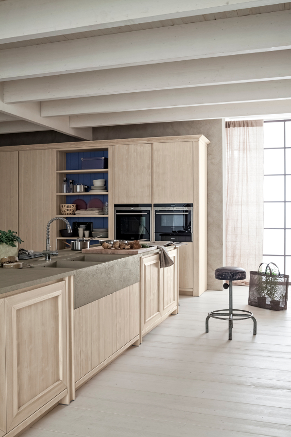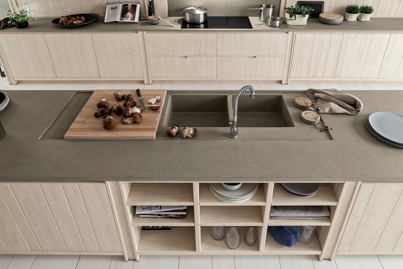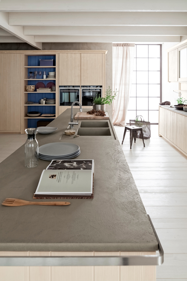 Das Zentrum der Zusammenstellung besteht aus einem von allen Seiten zugänglichen Inselelement, das ebenfalls eine 4 cm starke Platte aus Ökozement aufweist. Die in der Mitte liegende Spüle mit zwei Becken zeichnet sich durch einen abgesenkten Ausschnitt aus, der den Einsatz eines praktischen verschiebbaren Schneidbretts aus Buchenholz ermöglicht. Jedes Detail, von der Spüle bis zur Innenausstattung der Schubladen, wird sorgfältig geplant, um eine bequeme Nutzung zu garantieren und die alltäglichen Handgriffe zu erleichtern. Beachtenswert ist auch das in den Unterschränken der Insel eingesetzte offene Element, dessen Rückwand im originellen Farbton mirtillo lackiert ist, den wir auch bei den Regalen des Vorratsschranks wiederfinden.