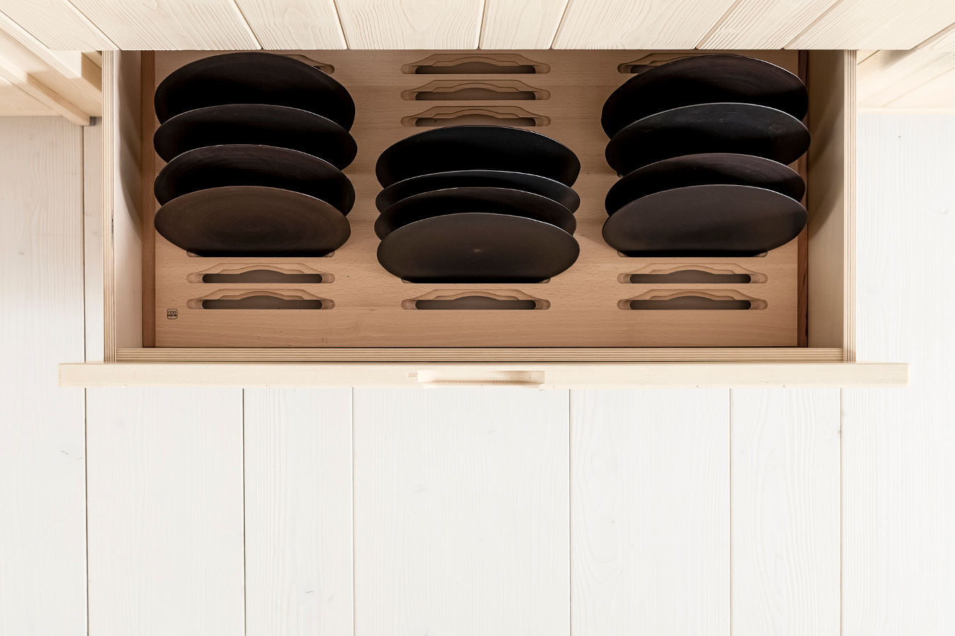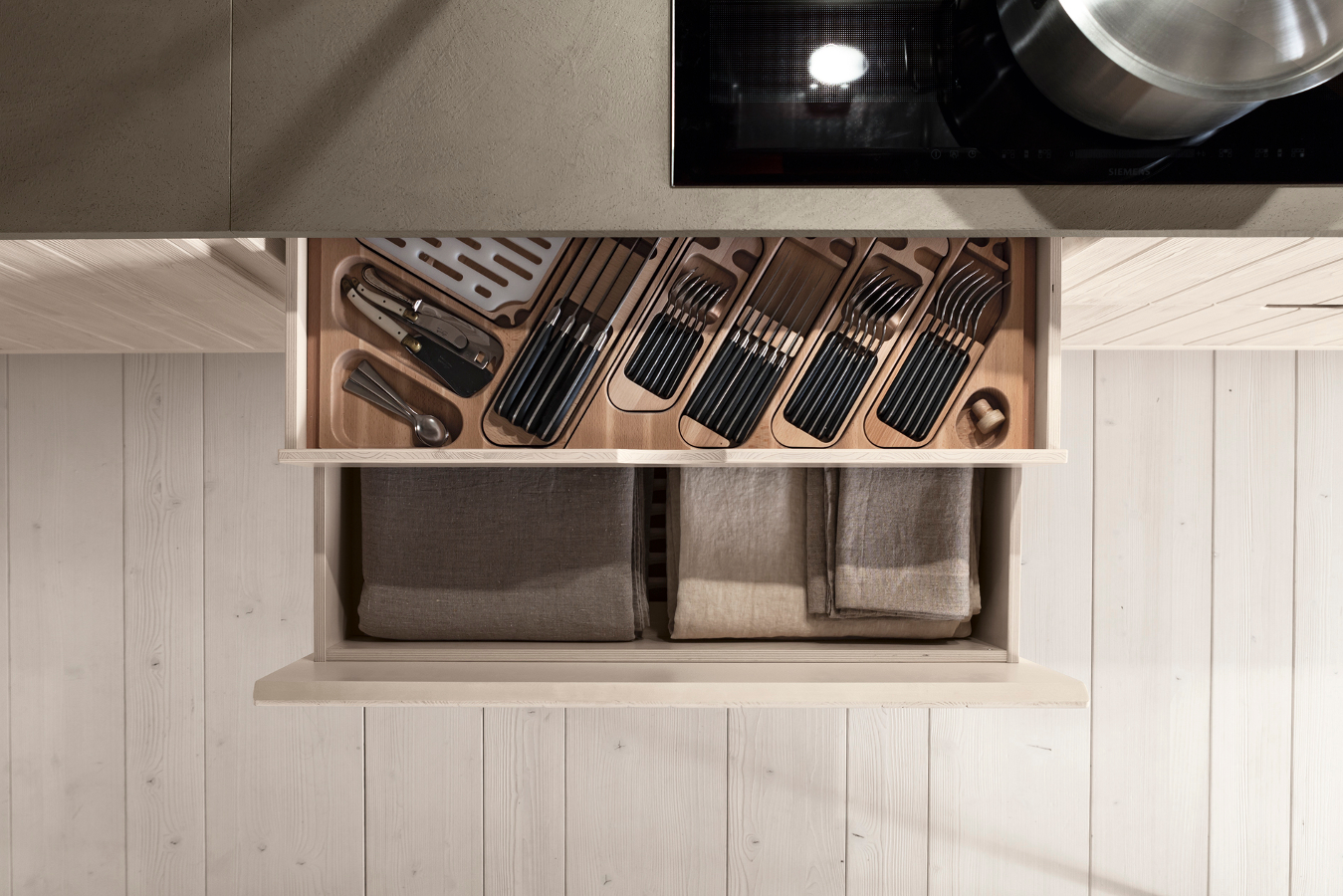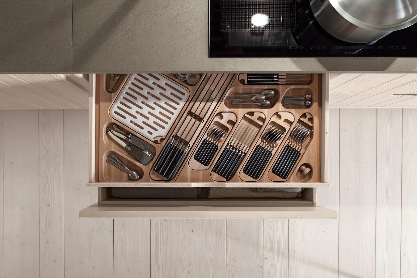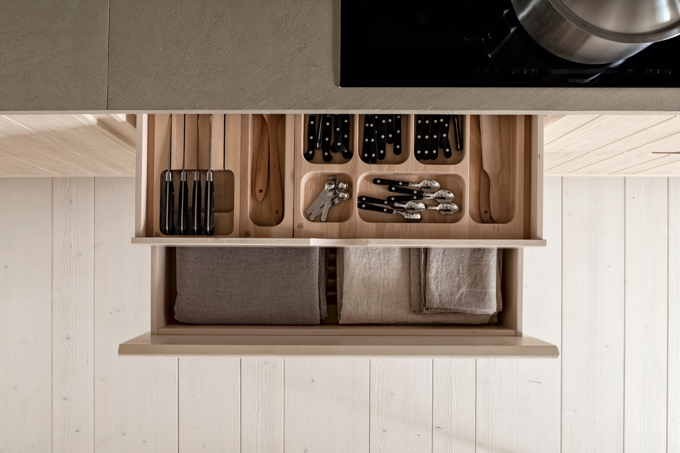 Das Zentrum der Zusammenstellung besteht aus einem von allen Seiten zugänglichen Inselelement, das ebenfalls eine 4 cm starke Platte aus Ökozement aufweist. Die in der Mitte liegende Spüle mit zwei Becken zeichnet sich durch einen abgesenkten Ausschnitt aus, der den Einsatz eines praktischen verschiebbaren Schneidbretts aus Buchenholz ermöglicht. Jedes Detail, von der Spüle bis zur Innenausstattung der Schubladen, wird sorgfältig geplant, um eine bequeme Nutzung zu garantieren und die alltäglichen Handgriffe zu erleichtern. Beachtenswert ist auch das in den Unterschränken der Insel eingesetzte offene Element, dessen Rückwand im originellen Farbton mirtillo lackiert ist, den wir auch bei den Regalen des Vorratsschranks wiederfinden.