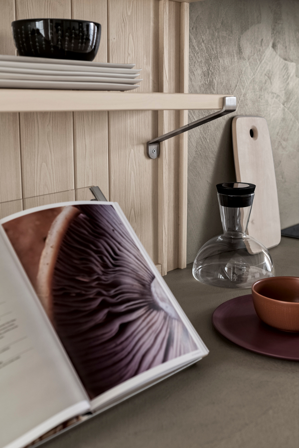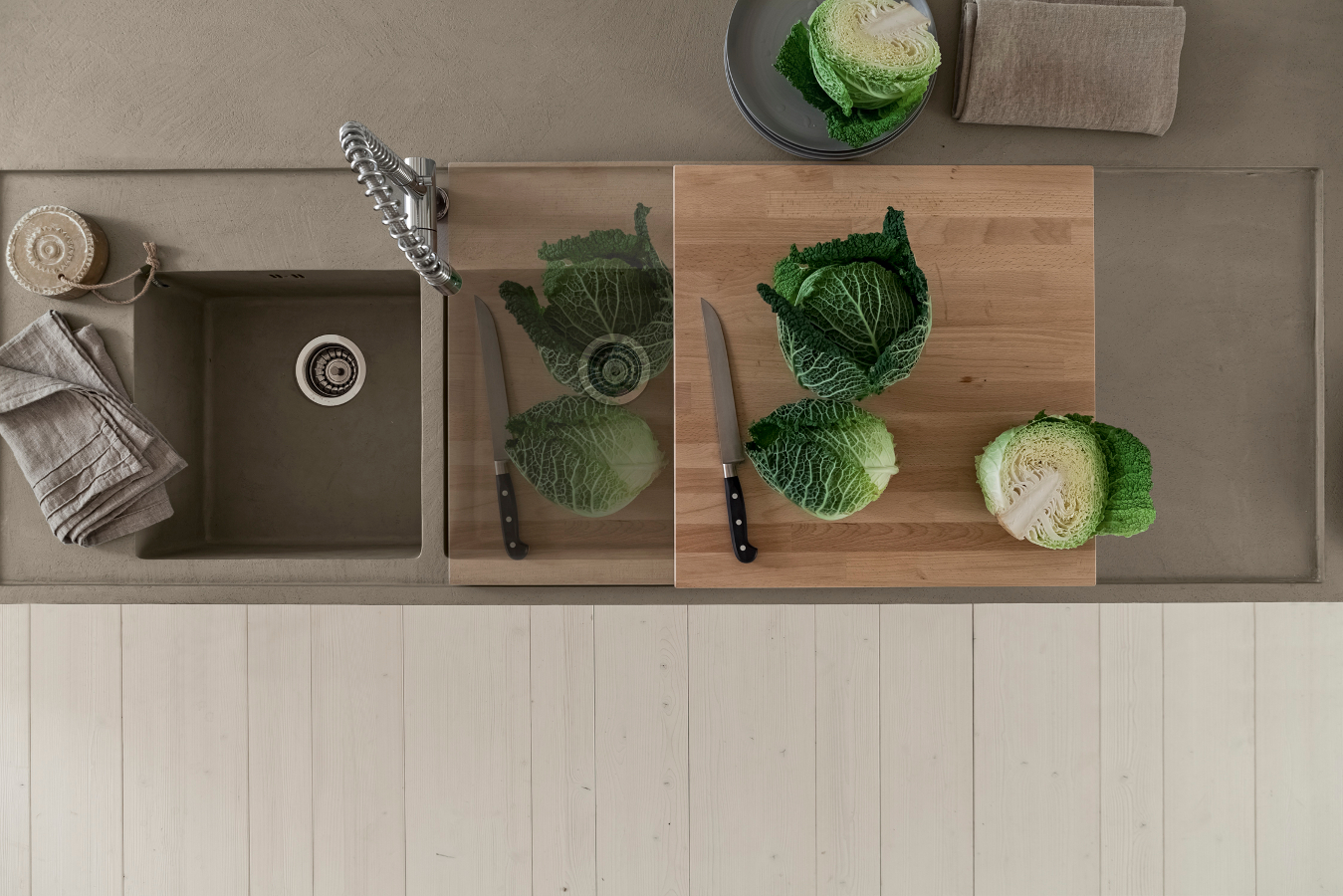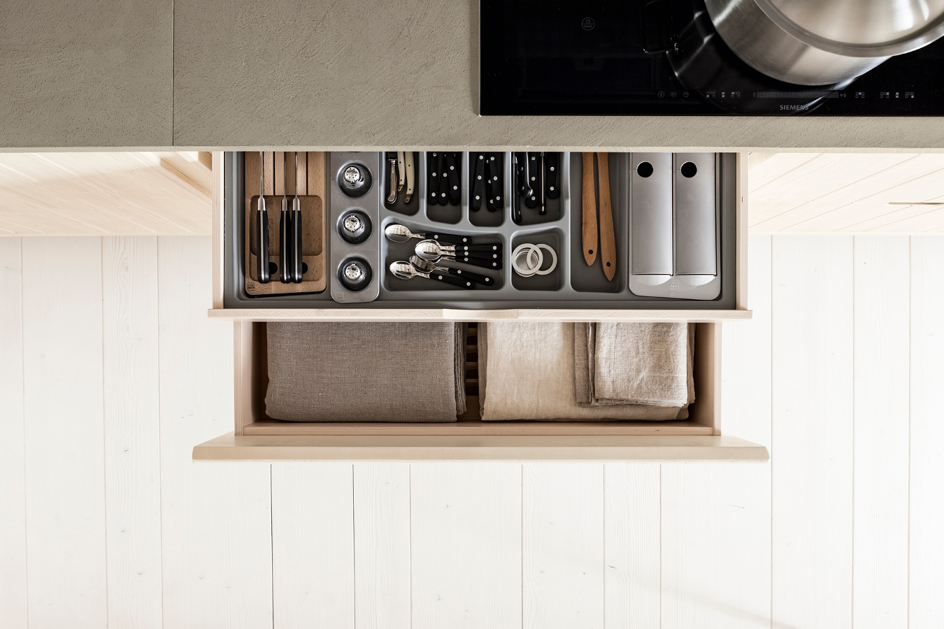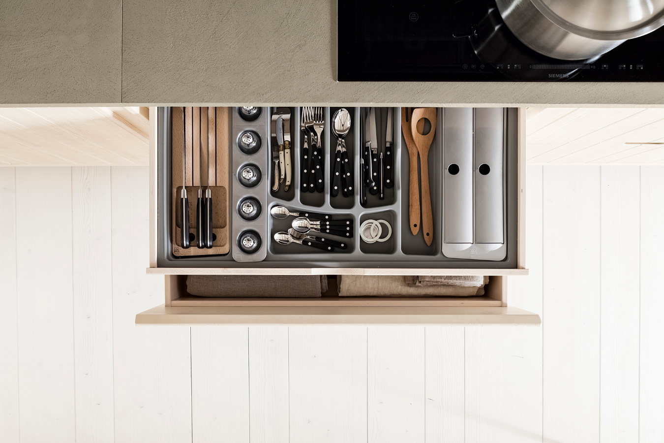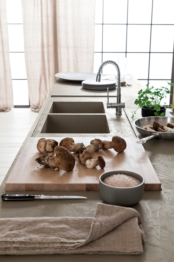 Das Zentrum der Zusammenstellung besteht aus einem von allen Seiten zugänglichen Inselelement, das ebenfalls eine 4 cm starke Platte aus Ökozement aufweist. Die in der Mitte liegende Spüle mit zwei Becken zeichnet sich durch einen abgesenkten Ausschnitt aus, der den Einsatz eines praktischen verschiebbaren Schneidbretts aus Buchenholz ermöglicht. Jedes Detail, von der Spüle bis zur Innenausstattung der Schubladen, wird sorgfältig geplant, um eine bequeme Nutzung zu garantieren und die alltäglichen Handgriffe zu erleichtern. Beachtenswert ist auch das in den Unterschränken der Insel eingesetzte offene Element, dessen Rückwand im originellen Farbton mirtillo lackiert ist, den wir auch bei den Regalen des Vorratsschranks wiederfinden.