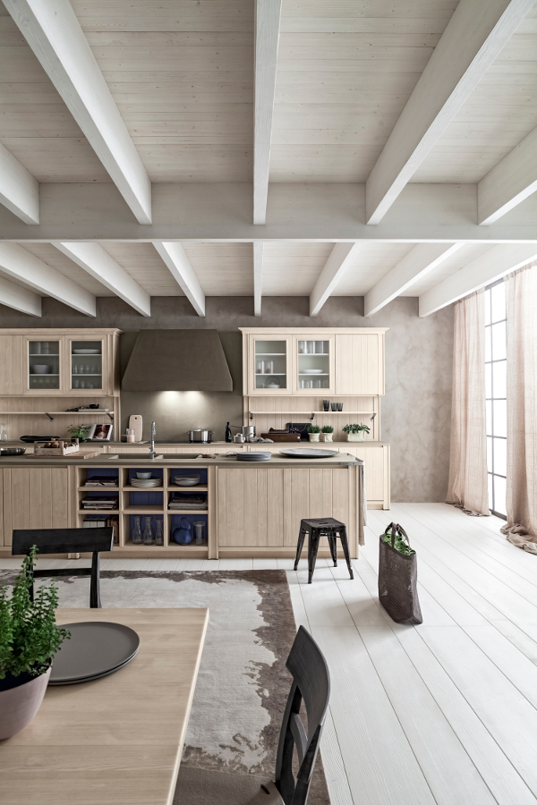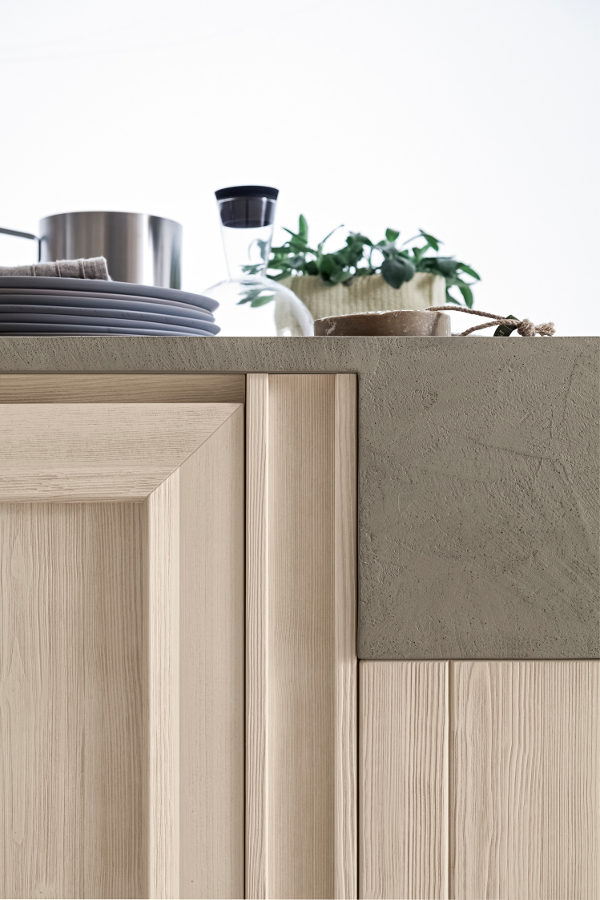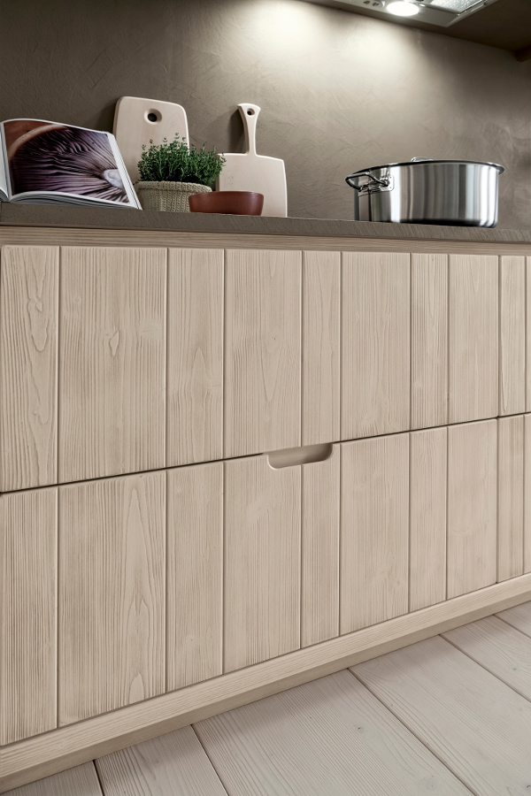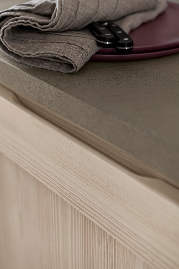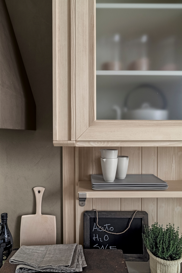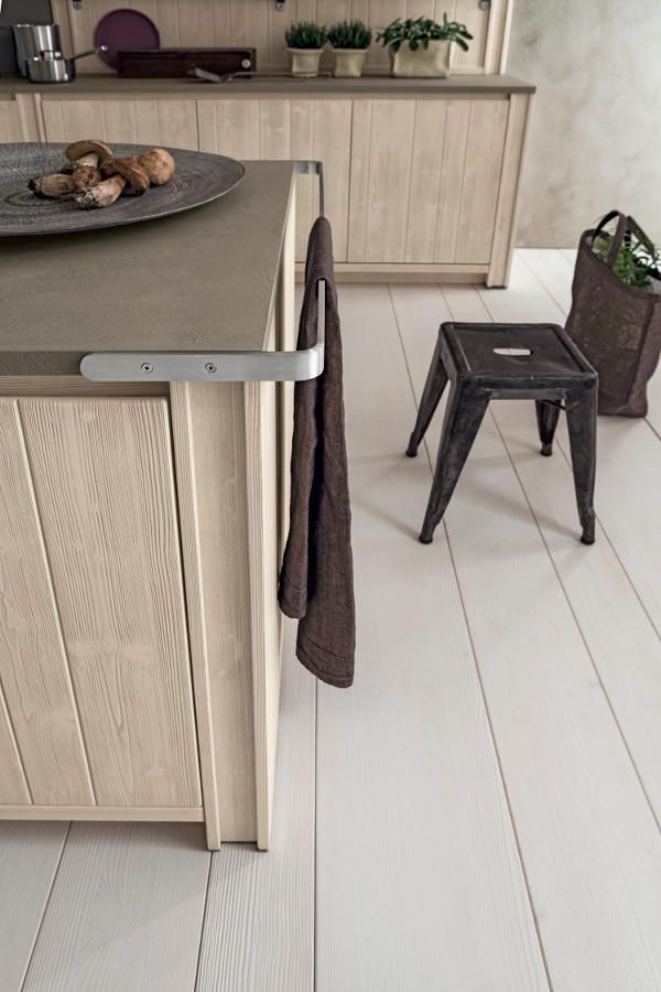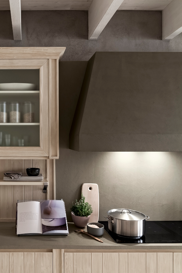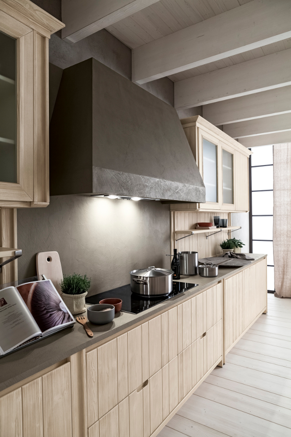 Im Hintergrund der Zusammenstellung steht eine lange Küchenzeile mit zentralem Kochfeld. Die Unterschränke der Küche zeichnen sich durch Türen mit rahmenloser Platte aus, die eine unregelmäßige Leistenoptik aufweisen und von Dekor-Seitenwänden Maestrale eingerahmt werden. Der erzielte Effekt weicht von klassischen Vorgaben ab und betont die Bearbeitung des Holzes, das die wahre Stärke der gesamten Produkton von Scandola Mobili darstellt. Die Arbeitsfläche ist sehr geräumig: Auf allen Küchenmöbeln liegt eine lange Abdeckplatte aus Ökozement auf, ein Material, das Zweckmäßigkeit und ästhetische Schönheit vereint und perfekt zu den hellen Tönen der Möbel aus Fichtenholz Ausführung perla passt. Ein weiterer Mittelpunkt der Küche ist die große Kaminabzugshaube, die auf beiden Seiten von Hängeschränken begrenzt wird. Die Rückwand hinter der Abzugshaube weist ebenfalls die Ausführung Ökozement fumo der Abdeckplatte auf und dient gleichermaßen als Schutz und Dekorelement. Bei den Hängeschränken wird der einheitliche Farbton der Küche durch Glastüren gemildert.
