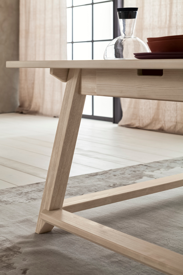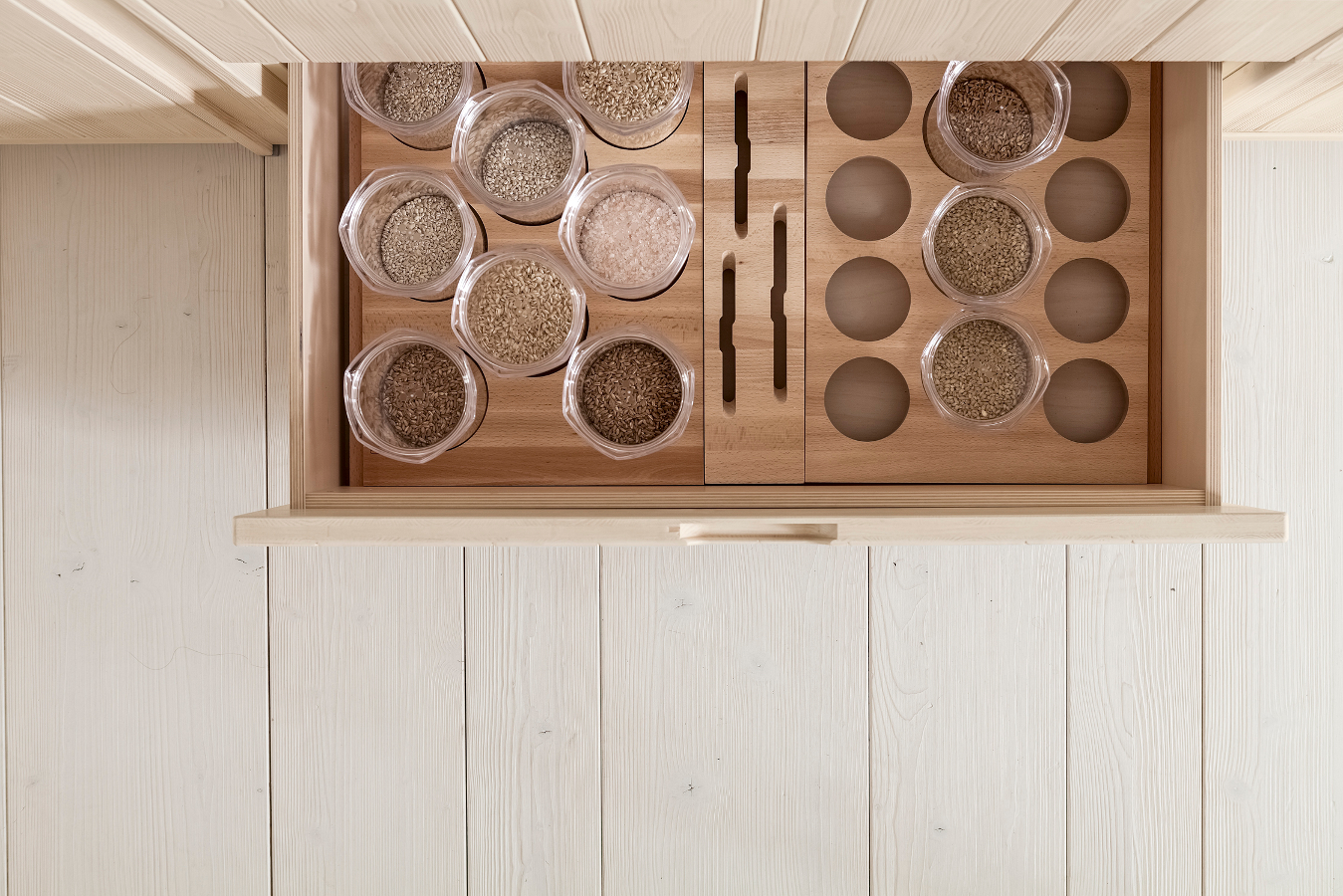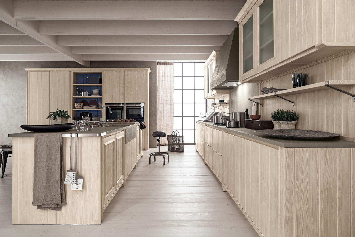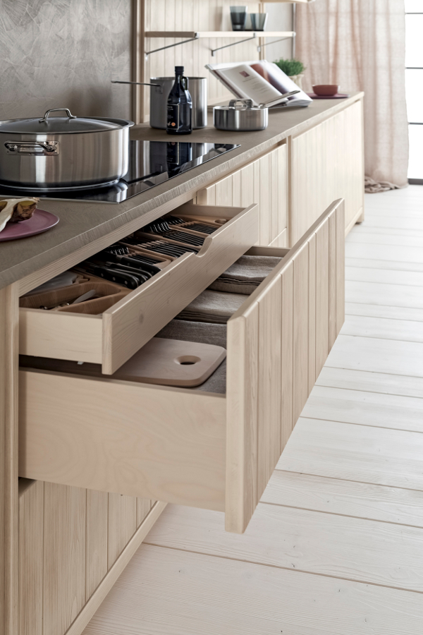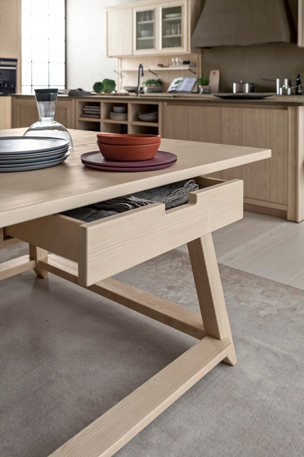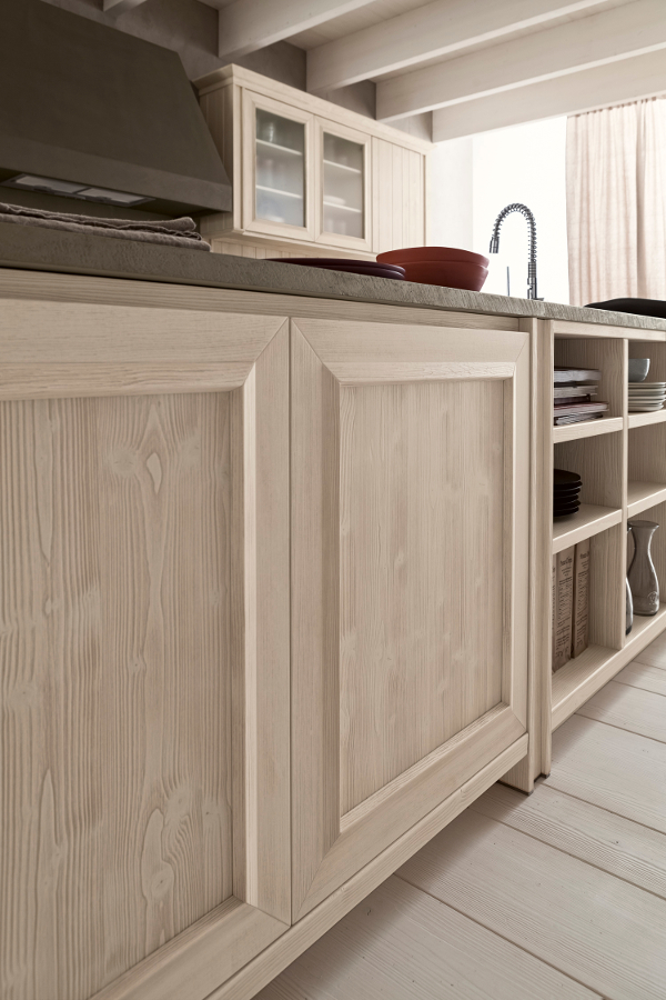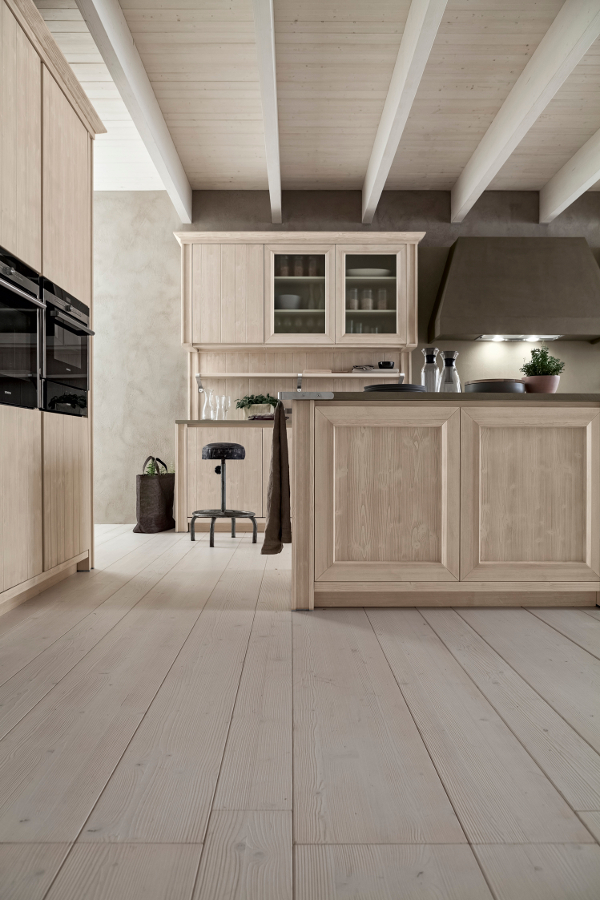 Bei jedem Element dieser Küche sticht das mit viel Liebe bearbeitete Holz hervor, das sich hier in der leuchtenden Ausführung bianco perla gebürstet präsentiert, um die Maserung des massiven Fichtenholzes hervorzuheben. Die Möbel des Programms Maestrale vereinen den Respekt vor der handwerklichen Tradition mit den Innovationen des modernen Designs. Das Ergebnis ist eine zeitgenössische Atmosphäre, die wohn- und lebenswerte Räume schenkt.