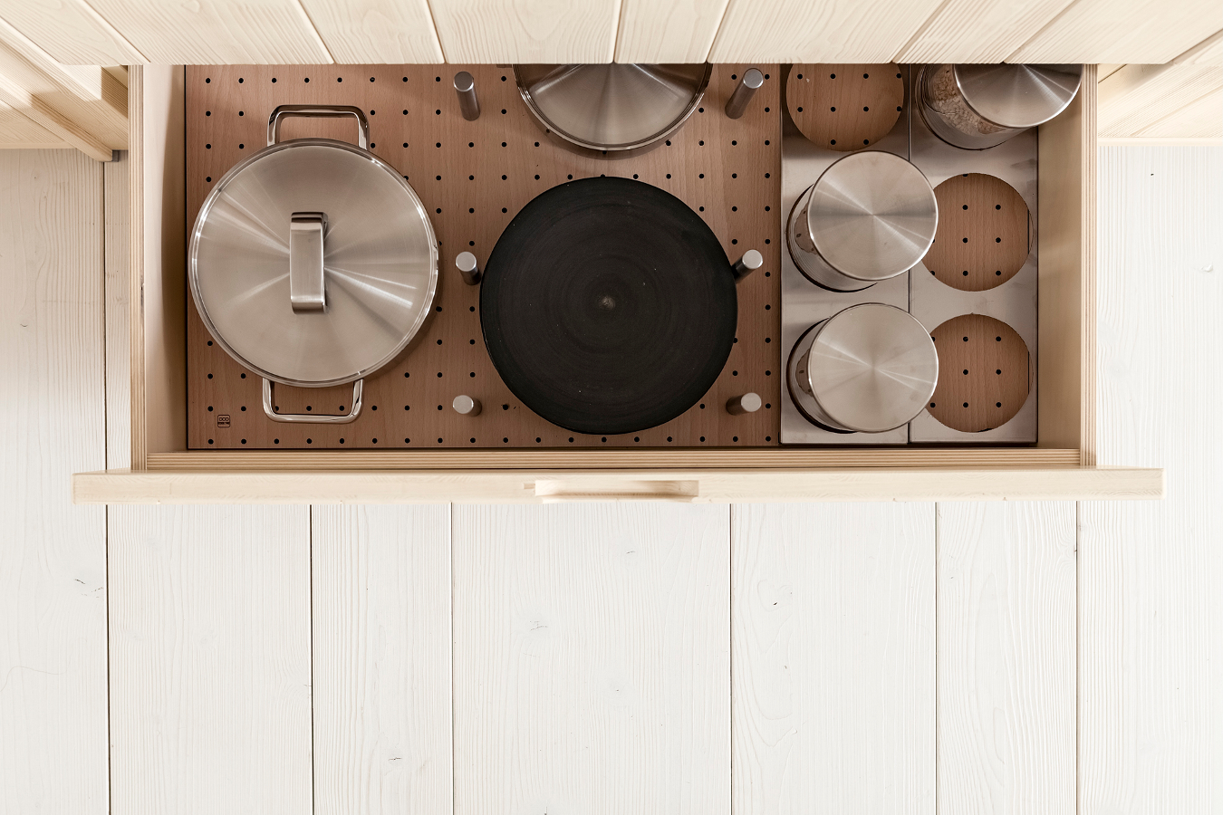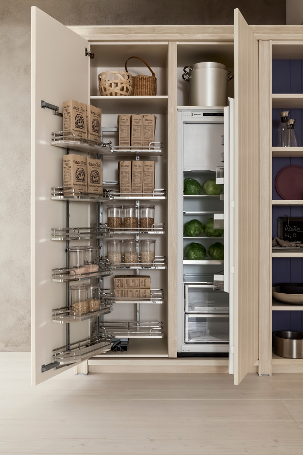 Der Vorratsschrank ist ein richtiger Küchenschrank, der über die ganze Wand reicht und neben dem offenen Element auch die wichtigsten Elektrogeräte beherbergt: Der Kühlschrank ist in einem Möbel aus Massivholz eingebaut, neben dem Backofen-Hochschrank findet auch Schrank für das Mikrowellengerät Platz.