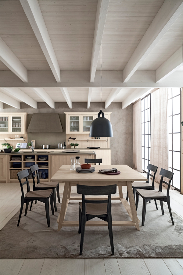 Die Küche wird von einem quadratischen Tisch mit Schublade und Stühlen Maestrale in Ausführung ardesia begleitet.