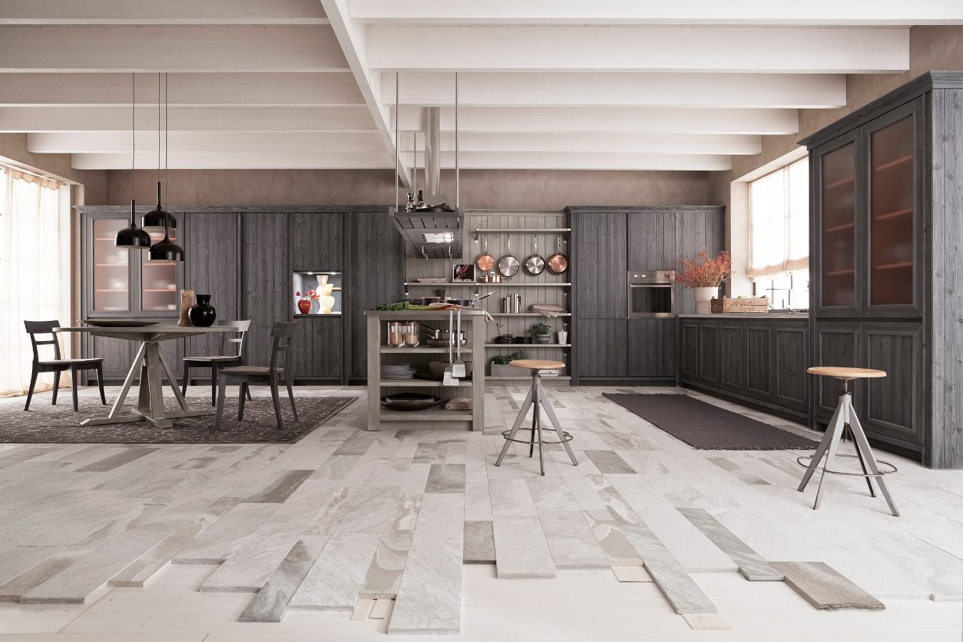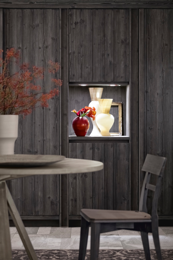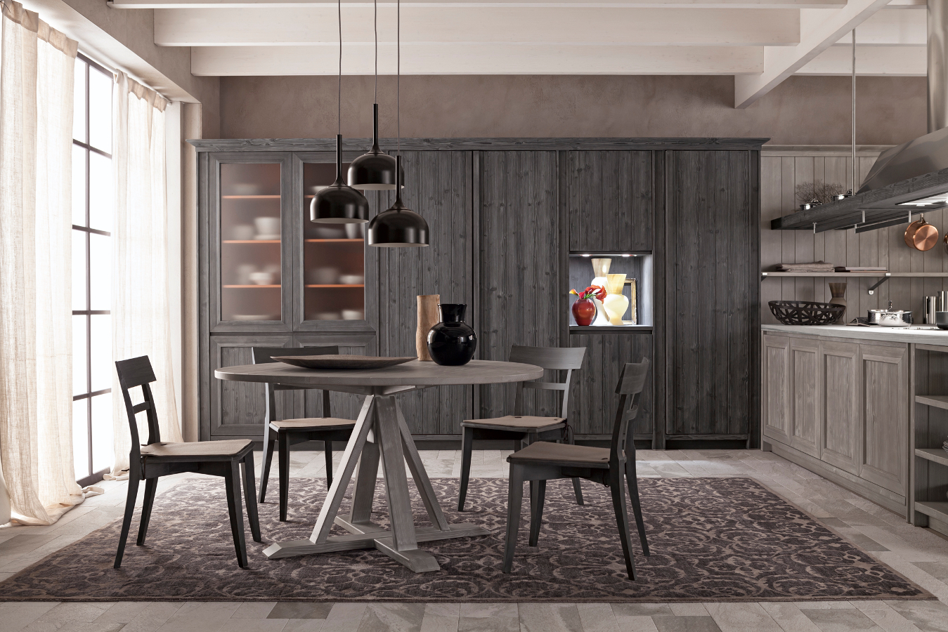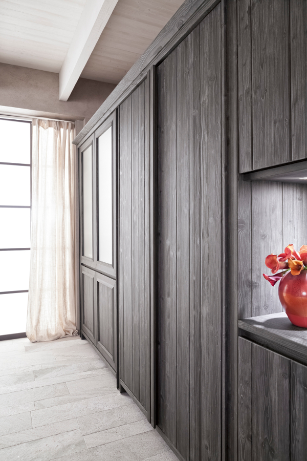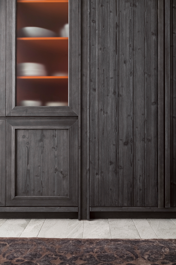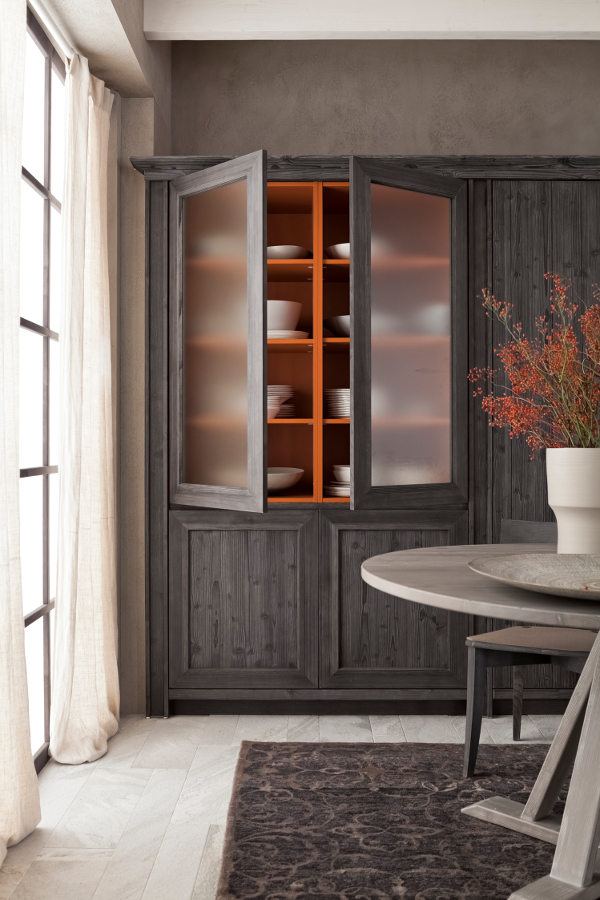 Diese Küche aus massivem Holz beeindruckt durch den dunklen Kontrast der schwarzen Küchenmöbel in Ausführung grafite und dem grauen Farbton der Wandverkleidung in ardesia, zu dem sich noch die Farbe der Arbeitsplatten aus Stein gesellt. Die lebhafte Lackierung in Farbe arancio aragosta im Inneren der Anrichte ist hingegen ein moderner und sehr origineller Kunstgriff, der auch durch die geätzten Scheiben des Glasschranks sichtbar wird und dem Esszimmer, wo ein schöner runder Tisch die Aufmerksamkeit auf sich zieht, einen besonderen Charakter schenkt.