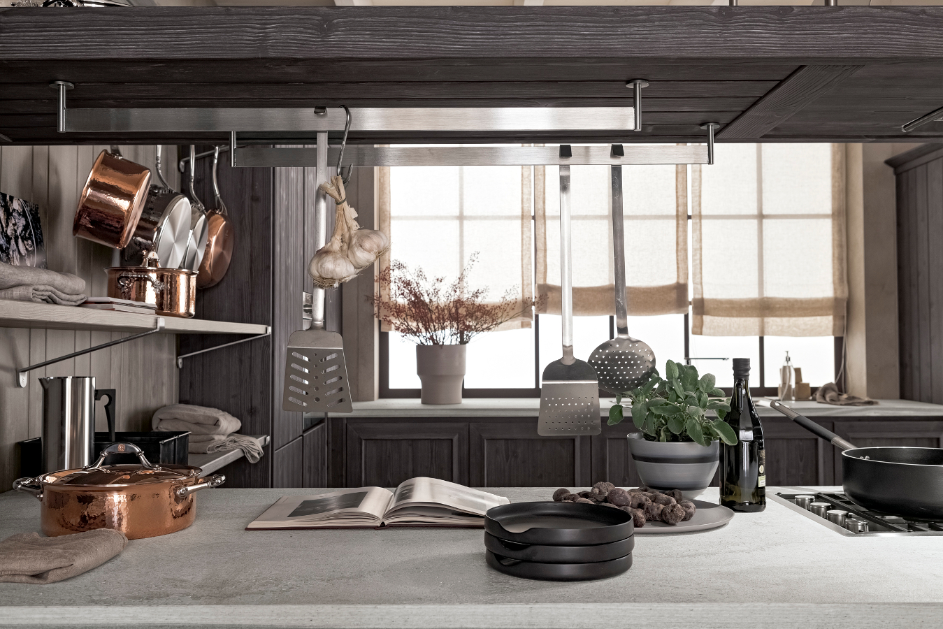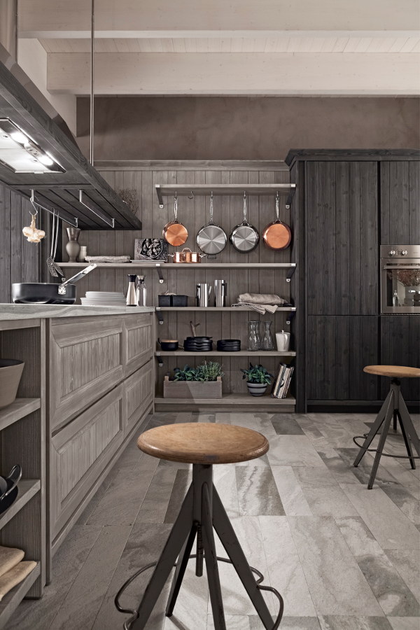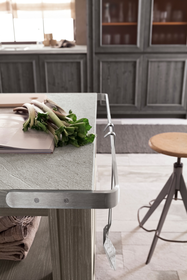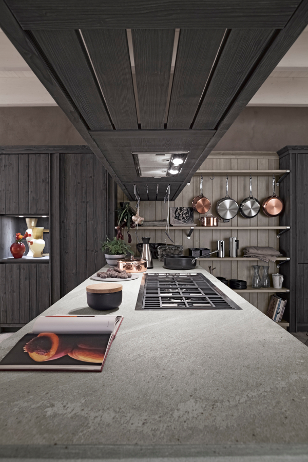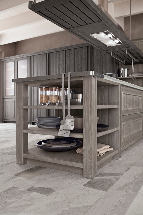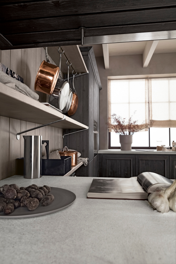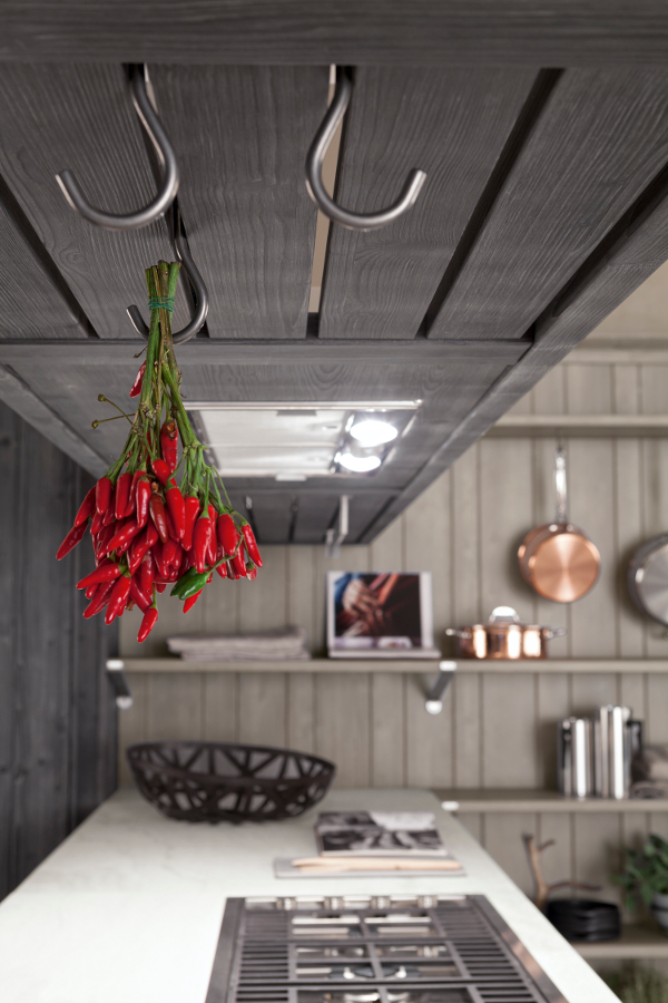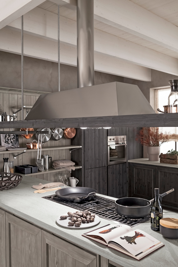 Die Eckküche besitzt großzügige Abmessungen und beinhaltet eine doppelte Arbeitsplatte, eine davon als Halbinselelement, einen großen Vorratsschrank, in dem auch die Elektrogeräte eingebaut sind, sowie eine Wandverkleidung mit Borden, auf denen Kupfertöpfe eine gute Figur machen. Die Küchenunterschränke sind mit großen Schubkästen und Türen ausgestattet, um auf funktionelle Weise Geschirr und Töpfe unterzubringen. Die Halbinselstruktur endet hingegen mit einem offenen Möbelelement. Auffallend die sichtbaren Bordhalter aus Edelstahl, die auf die Haltestange für Geschirrtücher am Ende des Halbinselelements abgestimmt sind. Die über den Unterschränken der Halbinsel aufgehängte Dunstabzugshaube hat eine moderne und essentielle Struktur, die auch eine Hängestange mit Haken für Pfannen und Küchenutensilien vorsieht. Auch bei der Abzugshaube kehrt das Thema Stahl zurück und schenkt in Kombination mit dem massiven Holz einen zeitgenössischen, innovativen Look, der nichts mit den klassischen Holzküchen von einst gemeinsam hat.