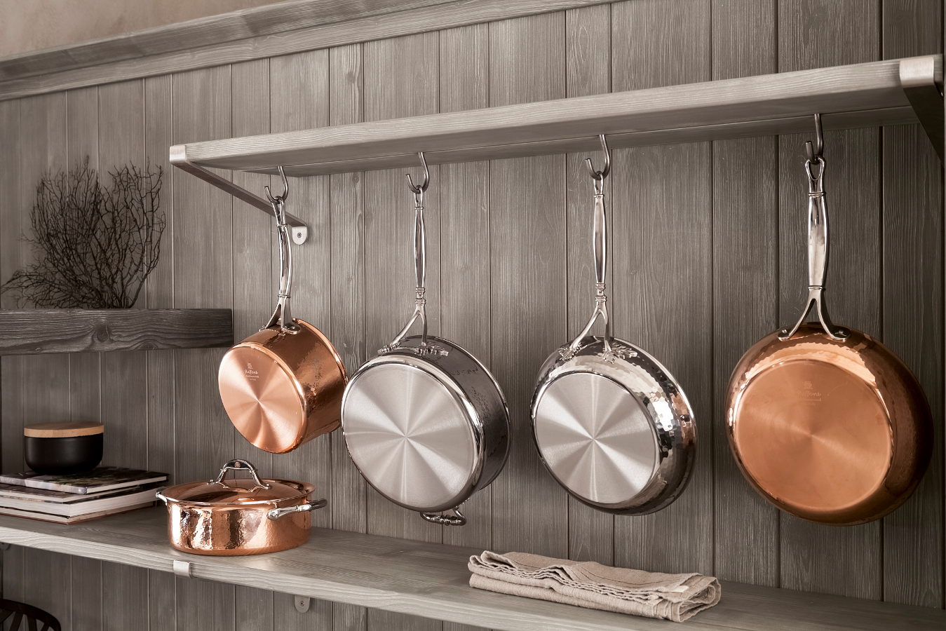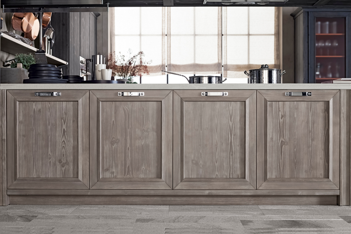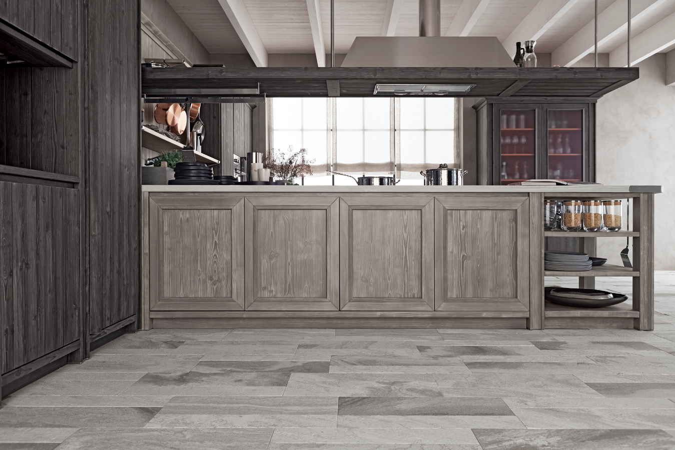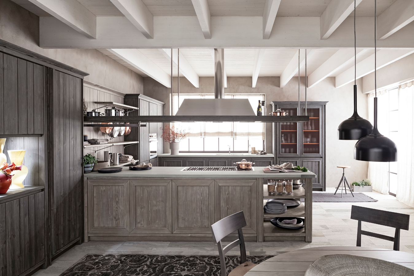 Die Eckküche besitzt großzügige Abmessungen und beinhaltet eine doppelte Arbeitsplatte, eine davon als Halbinselelement, einen großen Vorratsschrank, in dem auch die Elektrogeräte eingebaut sind, sowie eine Wandverkleidung mit Borden, auf denen Kupfertöpfe eine gute Figur machen. Die Küchenunterschränke sind mit großen Schubkästen und Türen ausgestattet, um auf funktionelle Weise Geschirr und Töpfe unterzubringen. Die Halbinselstruktur endet hingegen mit einem offenen Möbelelement. Auffallend die sichtbaren Bordhalter aus Edelstahl, die auf die Haltestange für Geschirrtücher am Ende des Halbinselelements abgestimmt sind. Die über den Unterschränken der Halbinsel aufgehängte Dunstabzugshaube hat eine moderne und essentielle Struktur, die auch eine Hängestange mit Haken für Pfannen und Küchenutensilien vorsieht. Auch bei der Abzugshaube kehrt das Thema Stahl zurück und schenkt in Kombination mit dem massiven Holz einen zeitgenössischen, innovativen Look, der nichts mit den klassischen Holzküchen von einst gemeinsam hat.