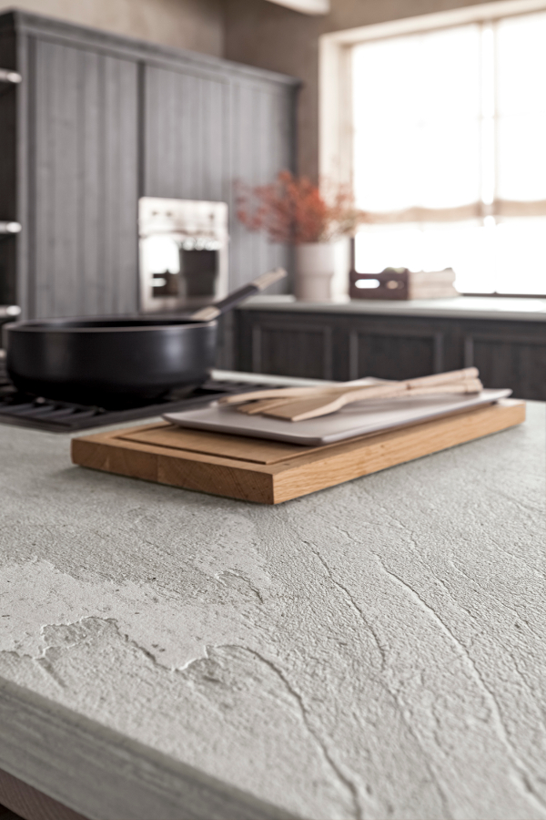 Ausführung: Grafite und Ardesia Türmodell: Nora und Fada Abdeckplatte: Stein stärke 3 cm Dunstabzugshaube Maestrale h 83-113 cm Seitenteil Maestrale stärke 9 cm