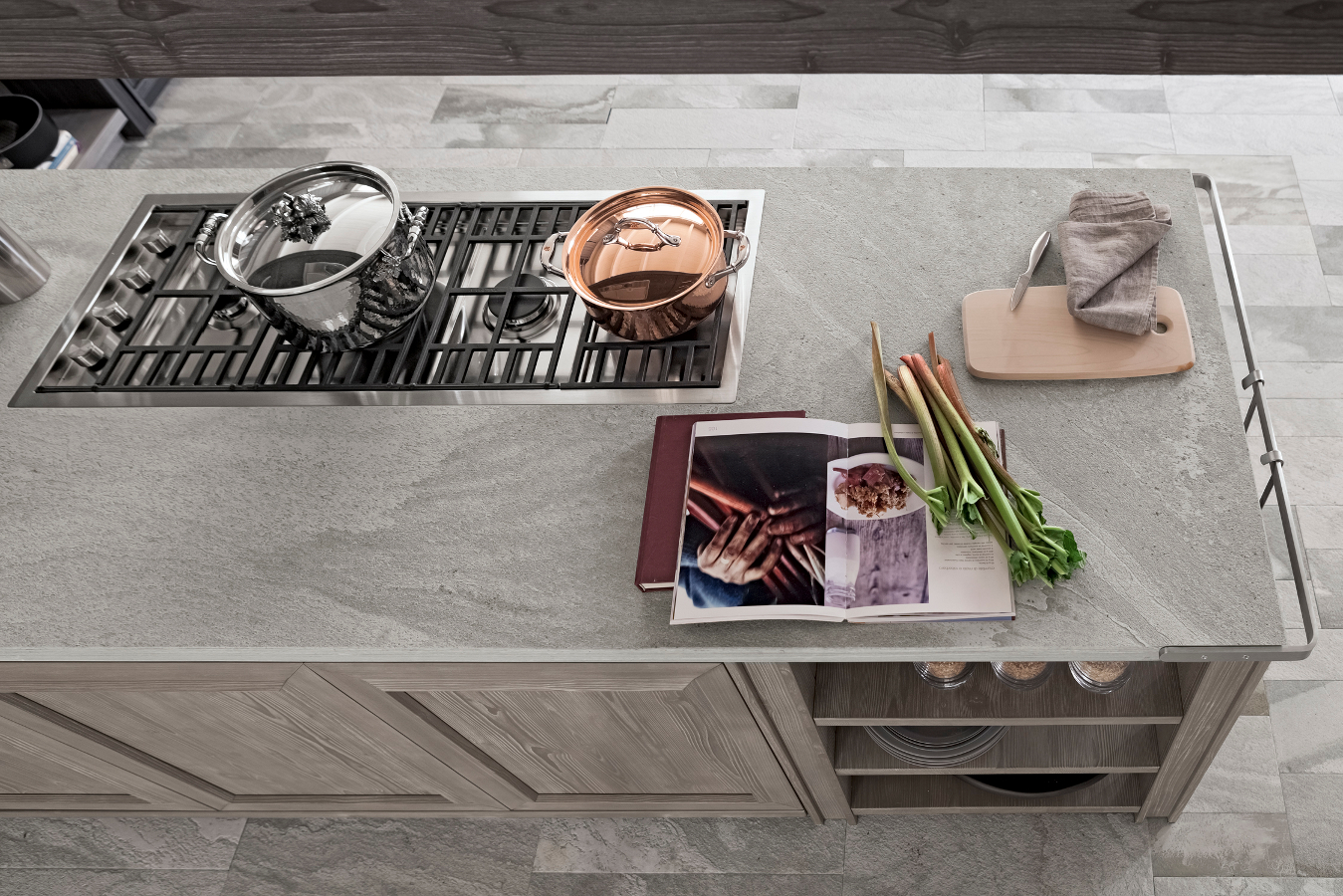 Küche Maestrale M02 mit Eckelement zwischen Unterschränken und Hochschränken. Ausführung grafite für deckenhängende Dunstabzugshaube, Unterschränke und Hochschränke, Wandverkleidung, Tisch und Halbinselelement in ardesia. Abdeckplatte der Küche Stärke 4 cm aus echtem Stein.