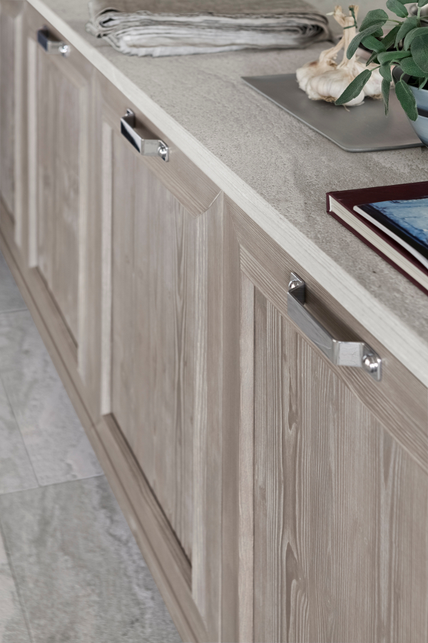 Die Möbel der Eckküche setzen sich über das Halbinselelement hinaus bis in den Wohnbereich fort und beweisen, dass die Eleganz der Serie Maestrale auch perfekt für die Einrichtung eines Wohnzimmers ist.