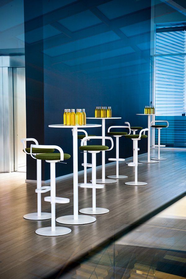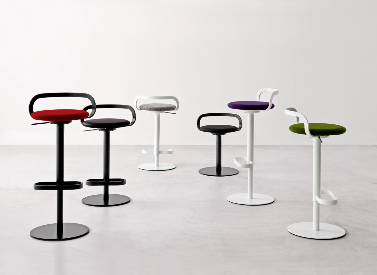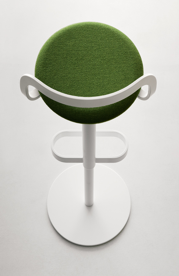Drehbarer Hocker, höhenverstellbar oder mit fixer Höhe, mit Gestell, weiß oder schwarz pulverlackiert, und Sitzschale mit Stoff oder Soft-Leder bezogen.