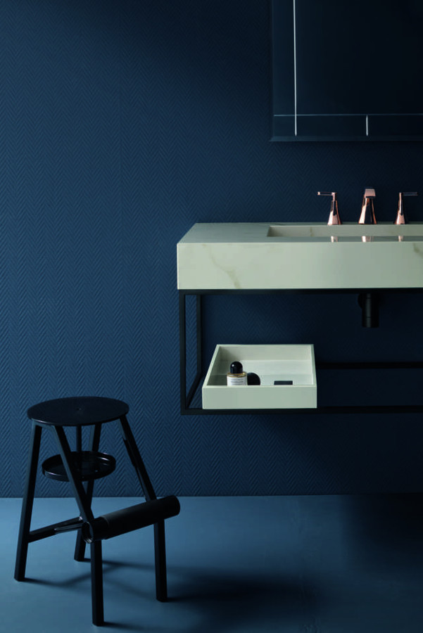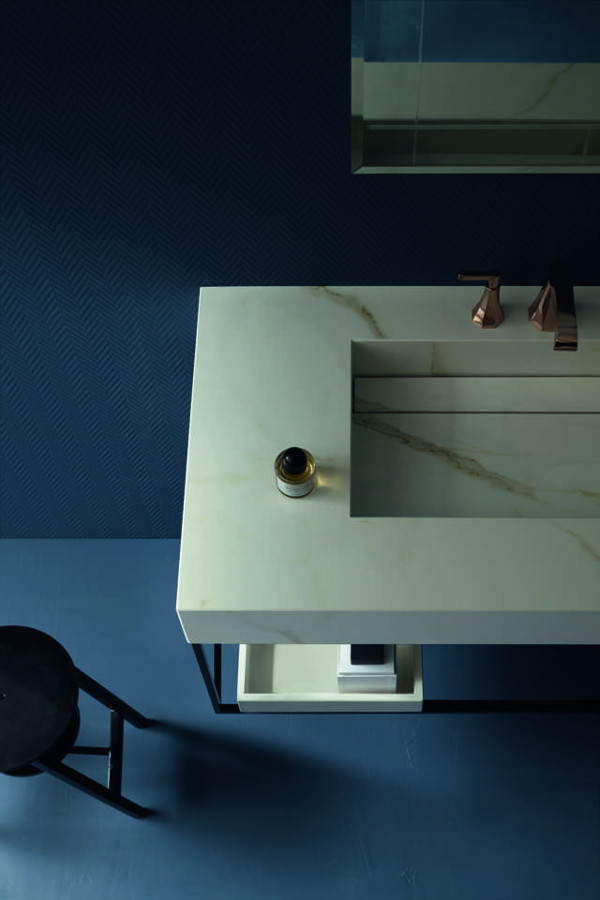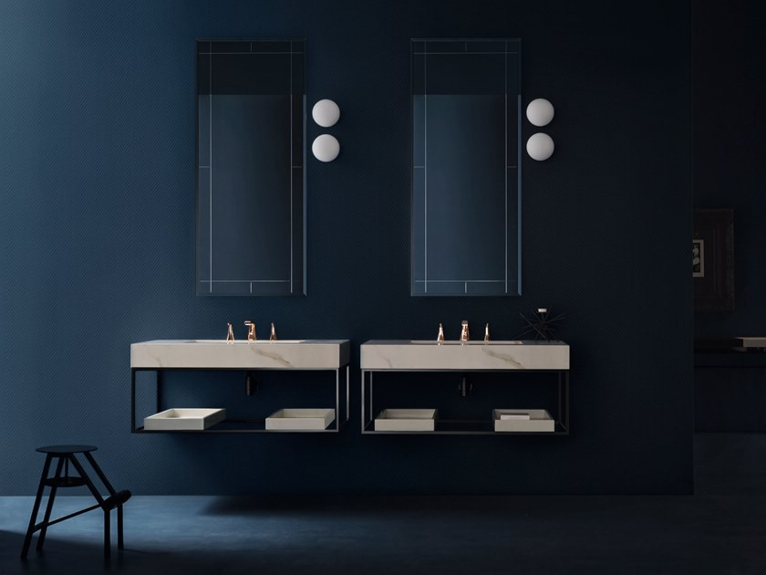 Die glänzenden, schwarzen Metallstrukturen können verwendet werden, um die Unterschränke zu stützen, geben der Zusammensetzung, zusammen mit den Roségold Abstandshaltern, einen Leichtigkeitseffekt, oder können auch verschiedene Waschtischplatten aufnehmen, wie z.B. Waschtischplatten H.12 cm mit integriertem Becken (realisiert in verschiedenen Materialien) oder Waschtischplatten mit Aufsatz-Becken. Die Lagerungsfunktion ist in diesem Fall durch Tabletts gegeben, die in den verschiedenen Ausführungen der Kollektion vorgeschlagen werden.