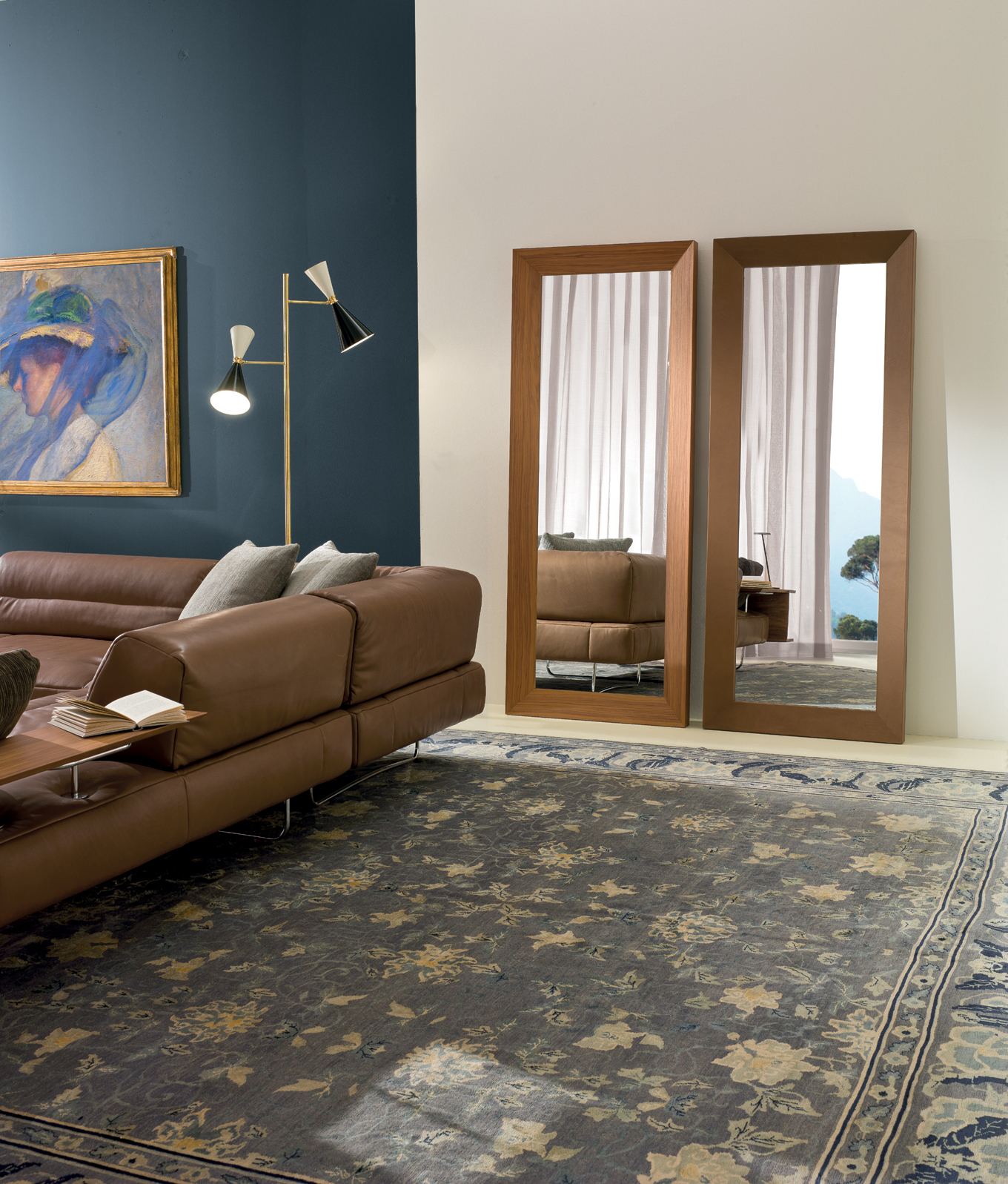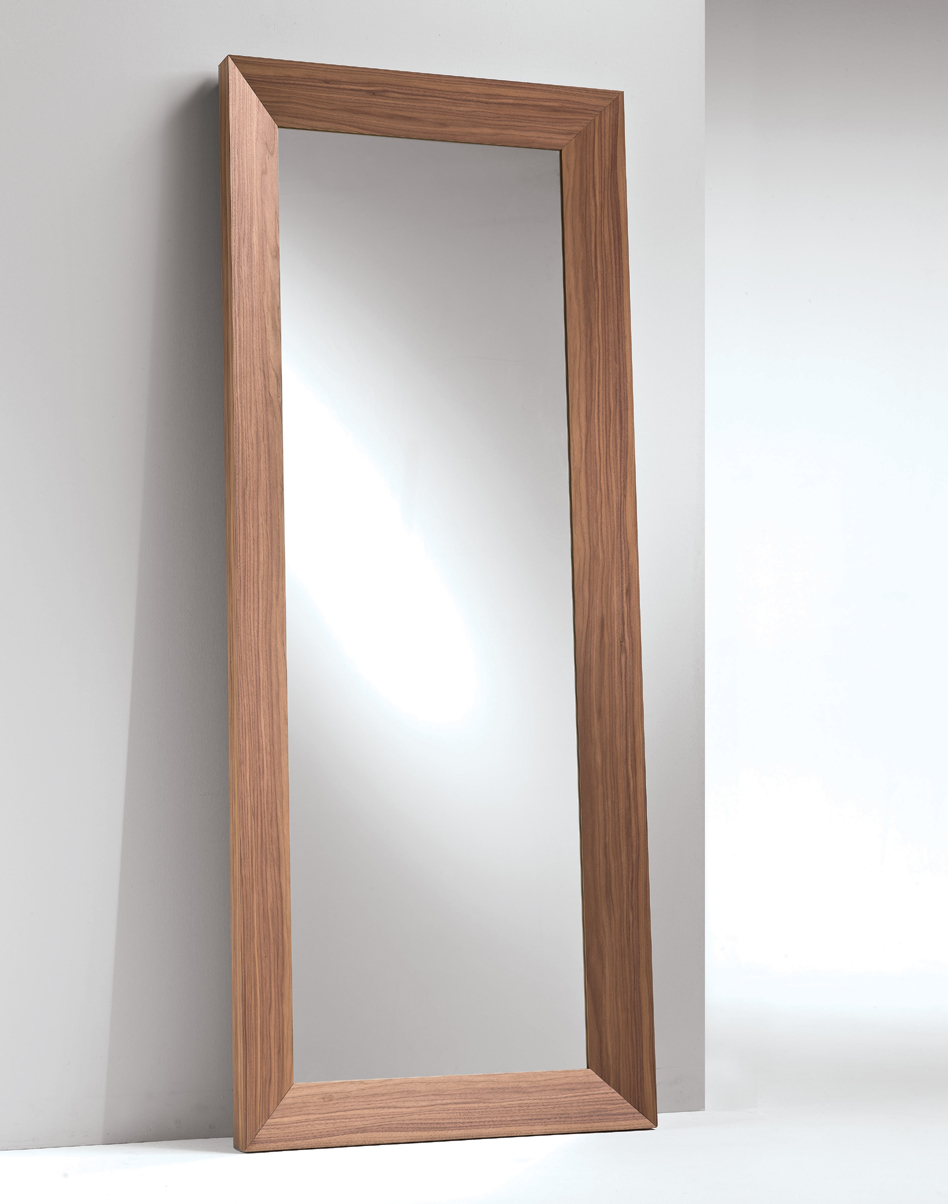 Der Rahmen des Spiegels besteht aus MDF Faserplatten, entweder mit geflammten Schwarznussholz furniert oder mit Leder überzogen. Die Verarbeitung in geflammten Schwarznussholz ist immer matt und mit „Wachseffekt“ versehen.