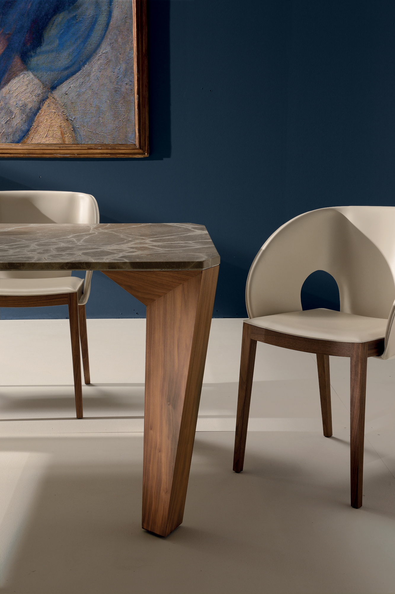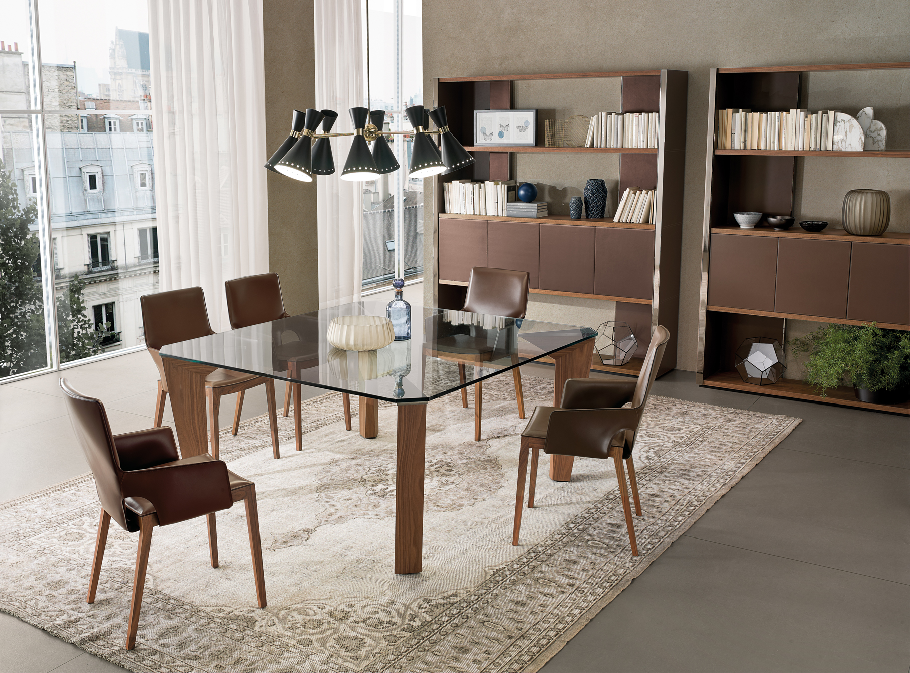 Das tragende Gestell des Stuhls ist in fester schwarzer Walnuss Holz oder in Quadratabschnitt roehrenformiger Stahl. Der Platz ist eine Buchesperrholz-Tafel ausgepolstert mit einem Blatt Polyurethan-Schaums bedeckten in Rindleder. Der Ruecken hat einen Rahmen in Stahlrute gekruemmt und bedeckt an beiden Seiten mit Rindleder und mit einem Blatt von Polyurethane in der Mitte.