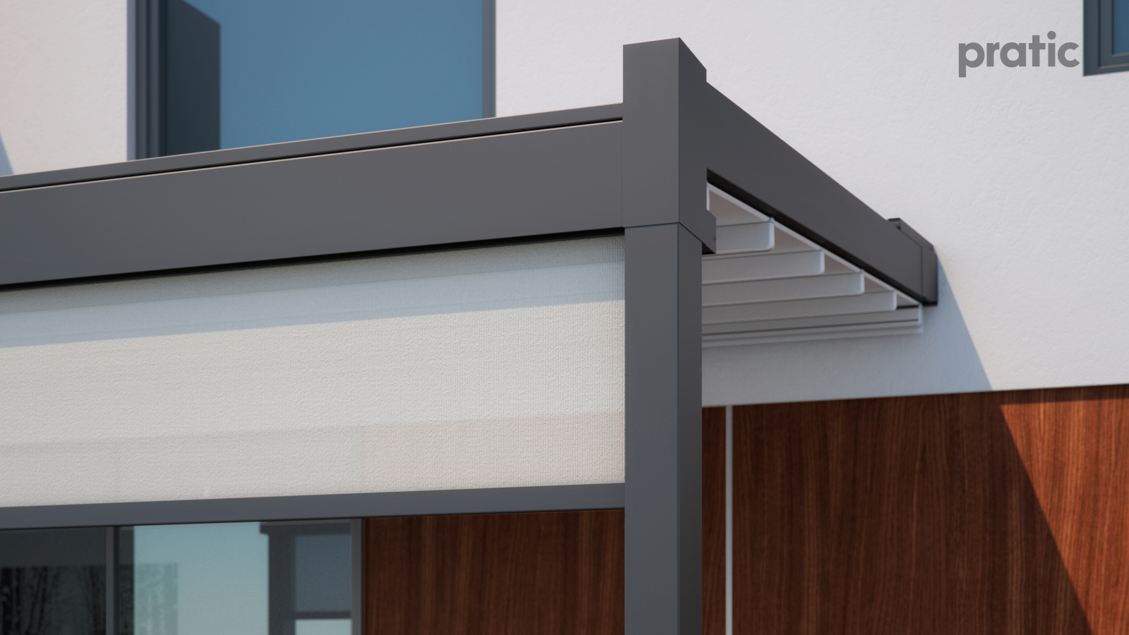 Aus Aluminium hergestellte Pergola mit Tecnic einziehbarem Tuch und mit vertikaler, integrierter Raso Markise (optional).