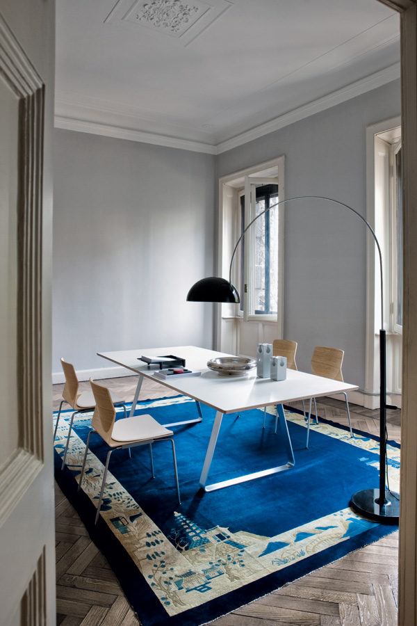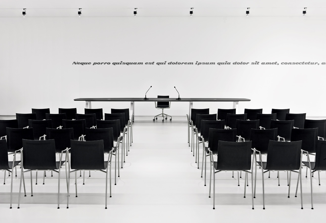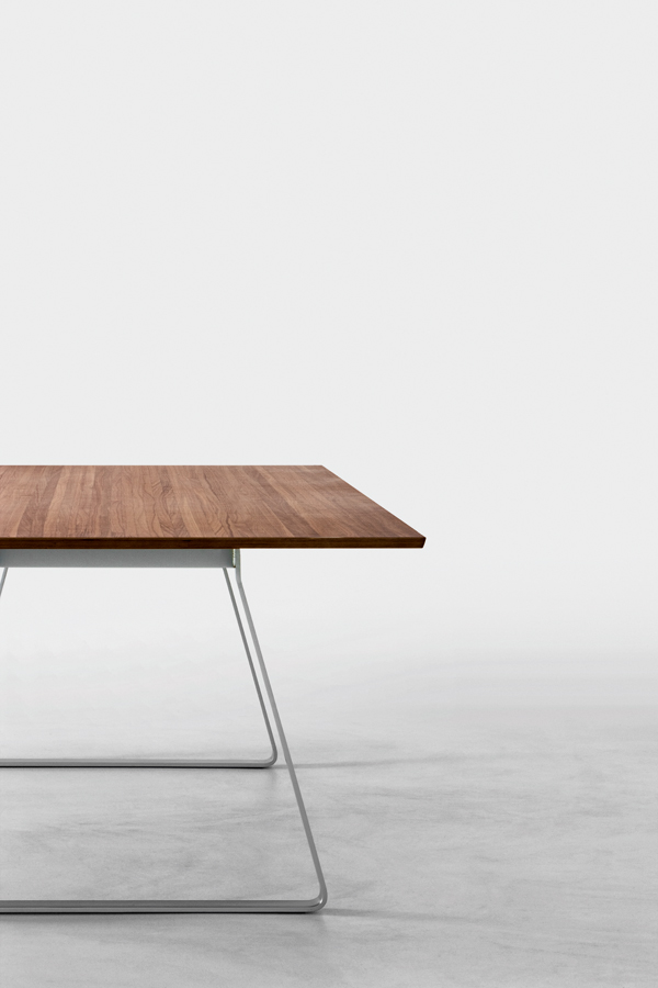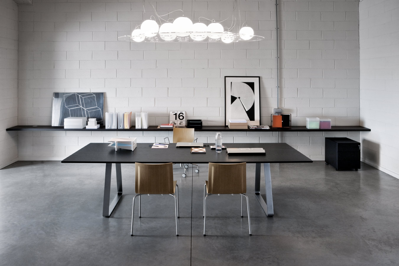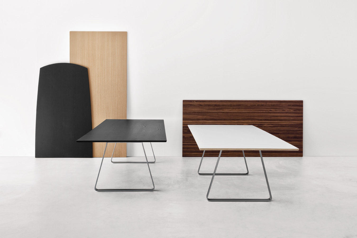 Tischsystem mit Metallgestell, matt verchromt, und Tischplatte aus Multiplex in verschiedenen Ausführungen.