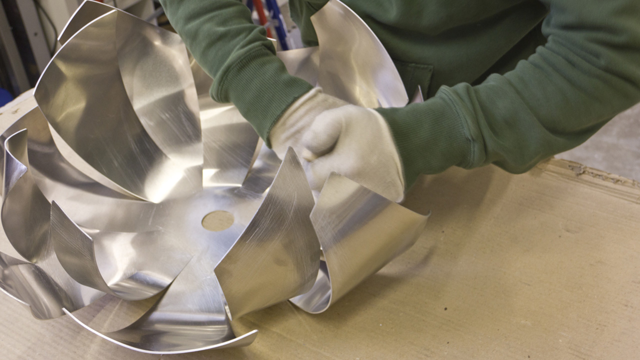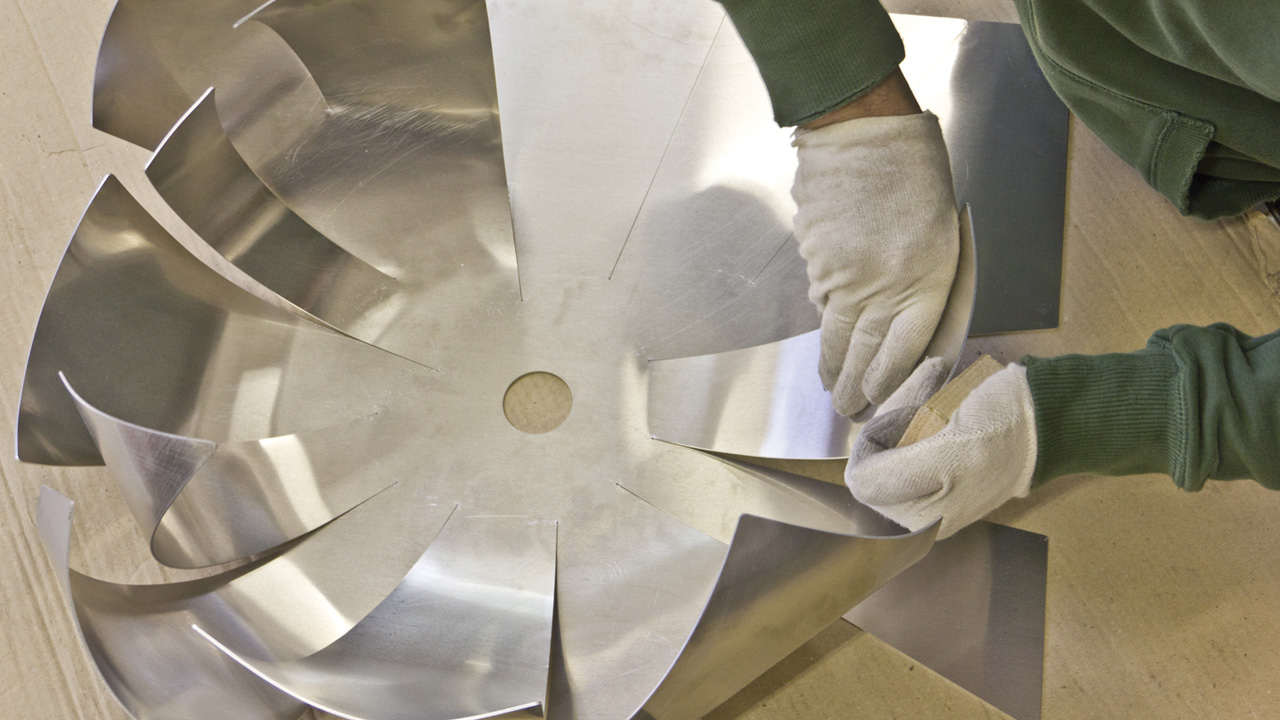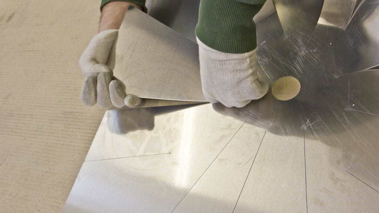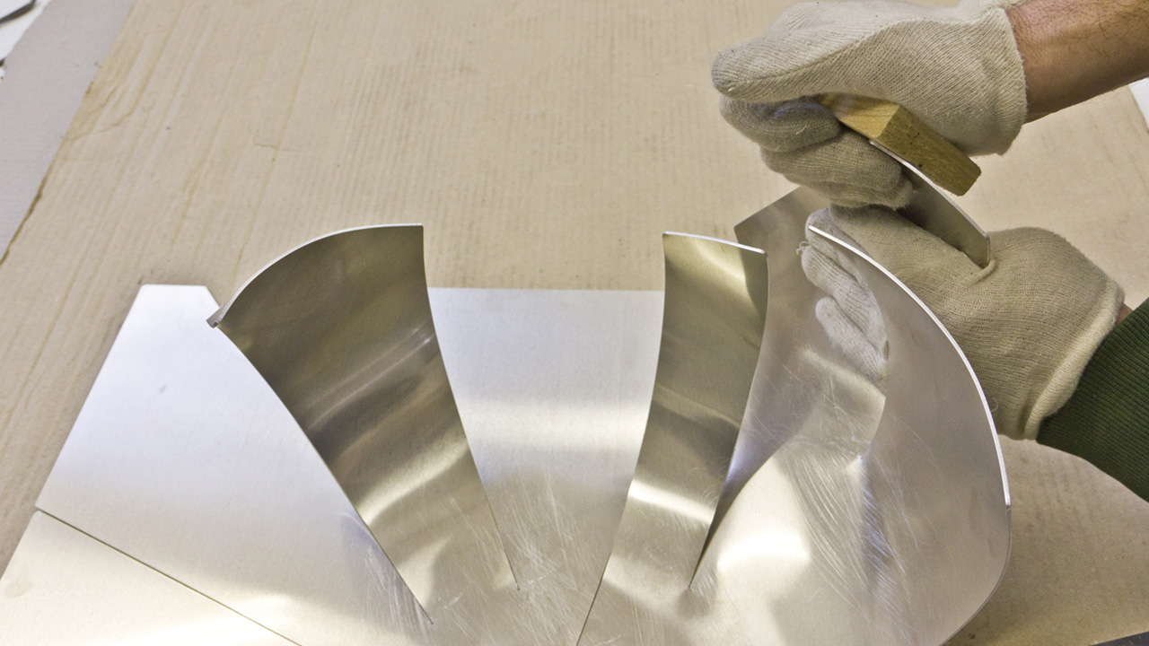 Das Handfalten des Aluminiumblechs beginnt.