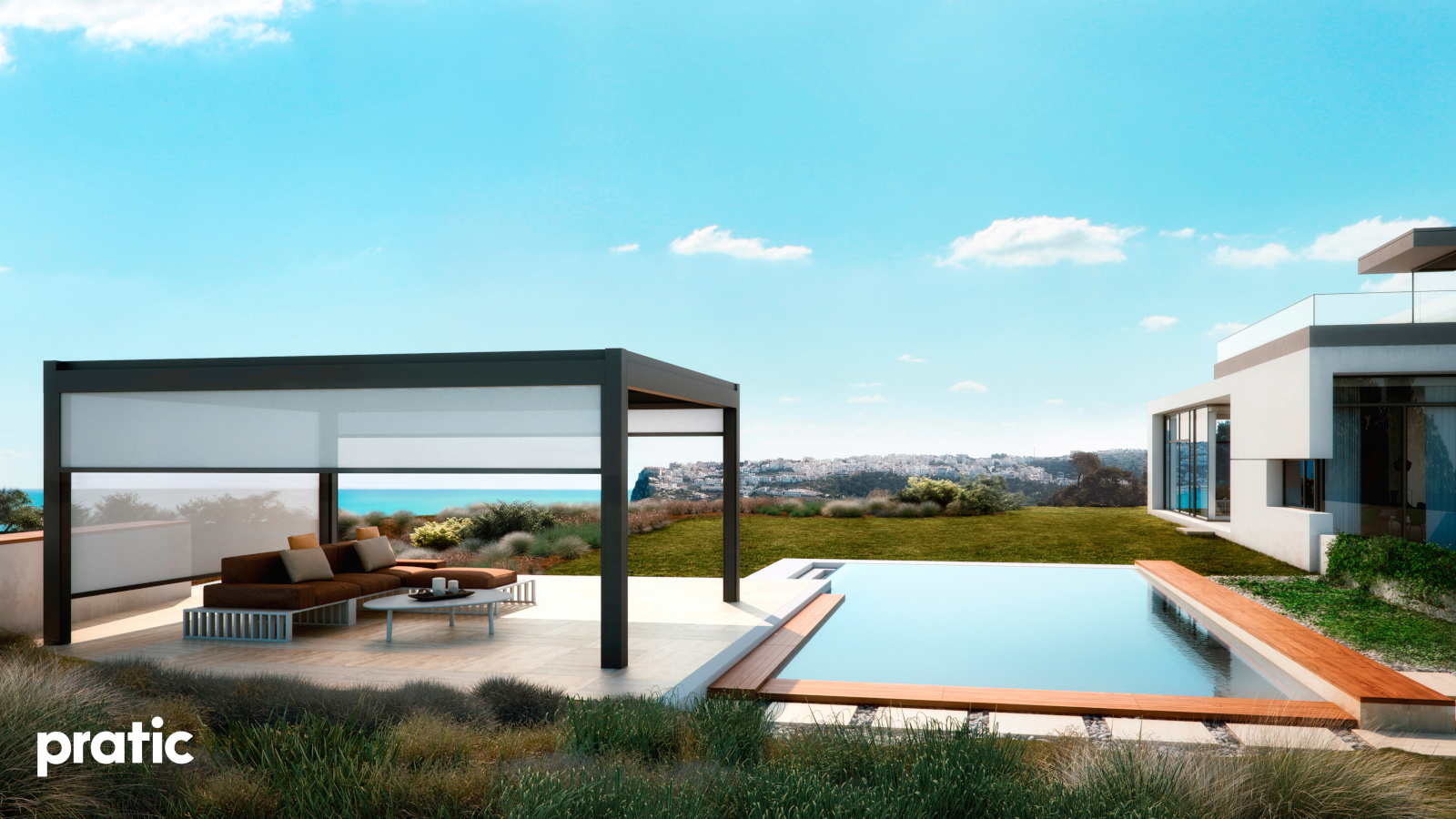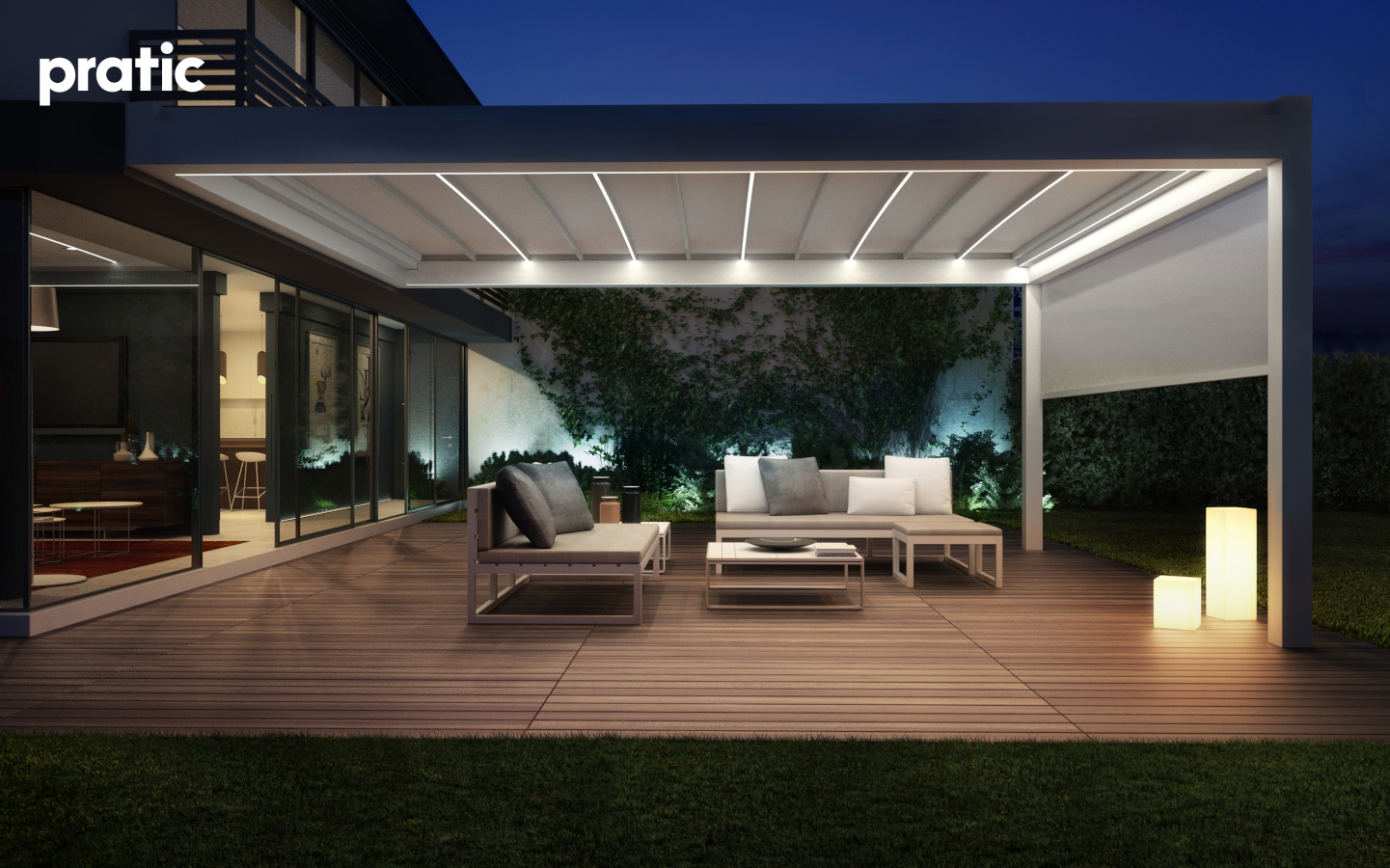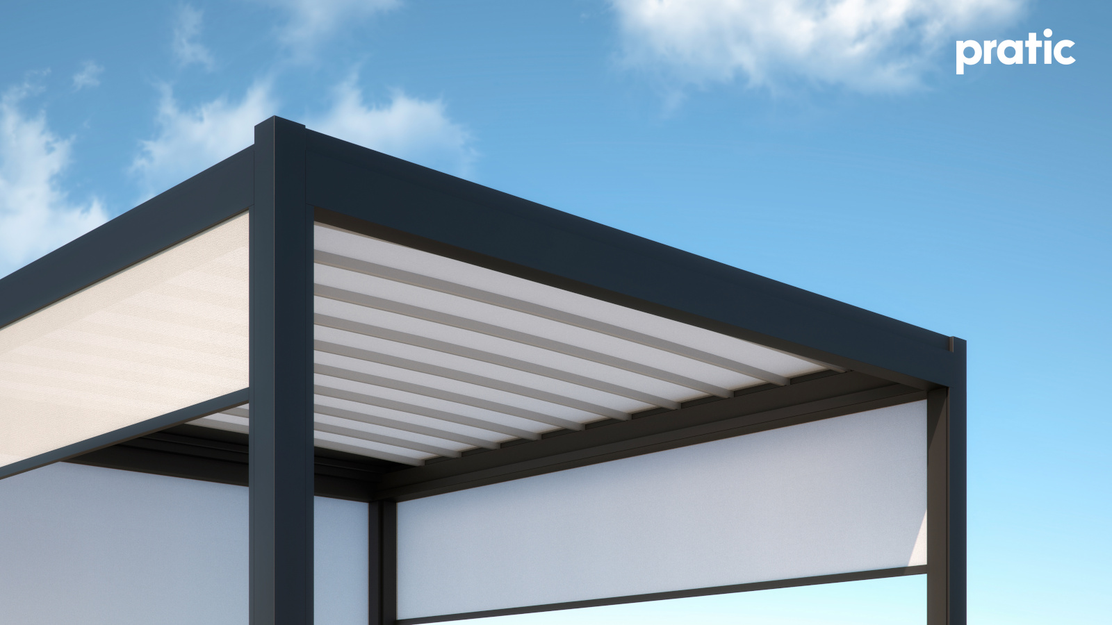 Aus Aluminium hergestellte Pergola mit einziehbarer Tecnic Abdeckung (gespanntes Tuch mit seitlichem Ablauf).