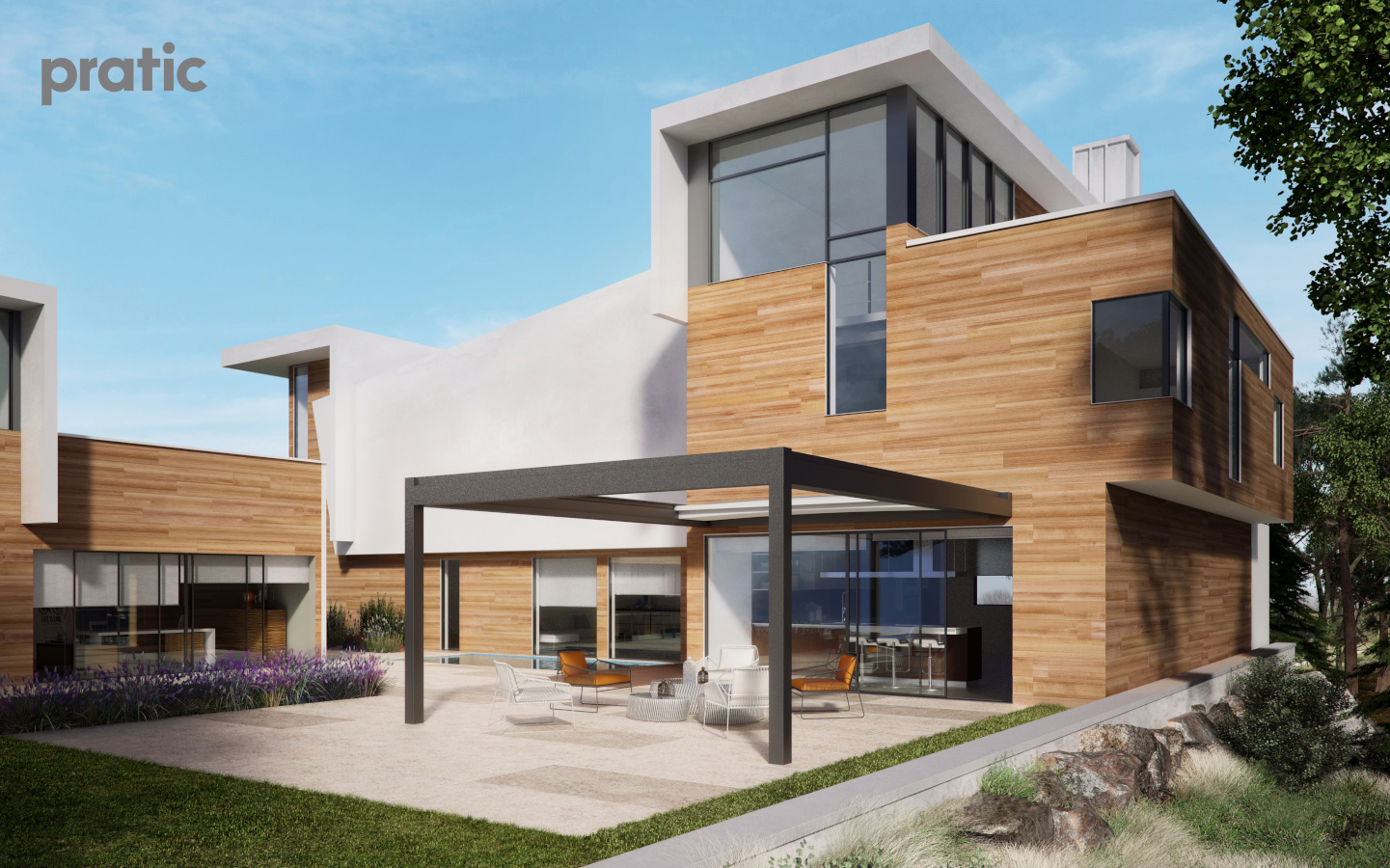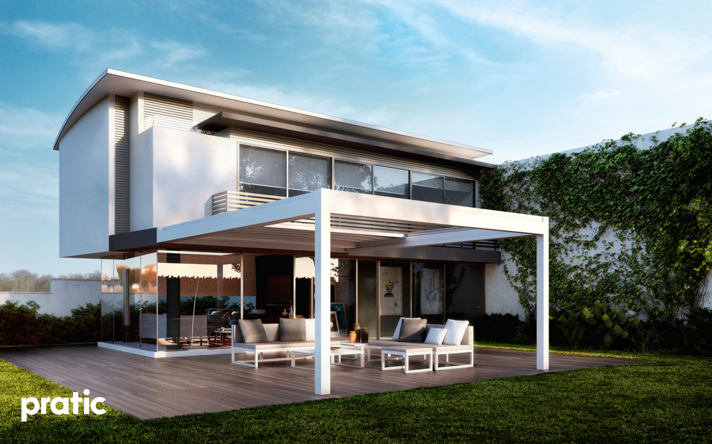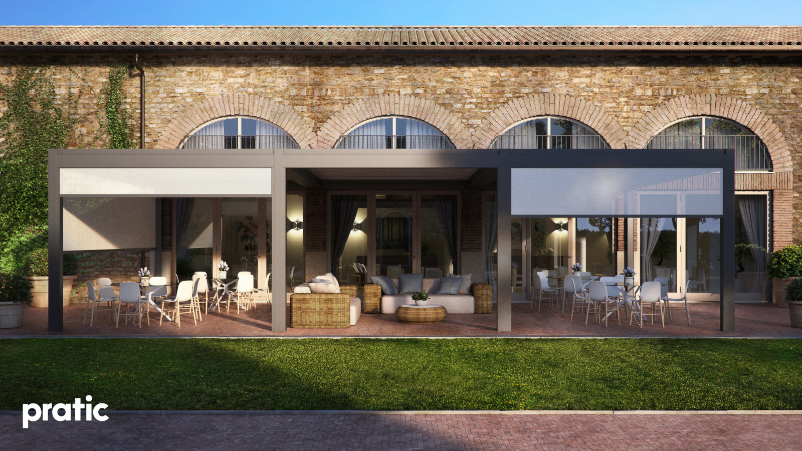Aus Aluminium hergestellte Pergola mit einziehbarer Tecnic Abdeckung (gespanntes Tuch mit seitlichem Ablauf).