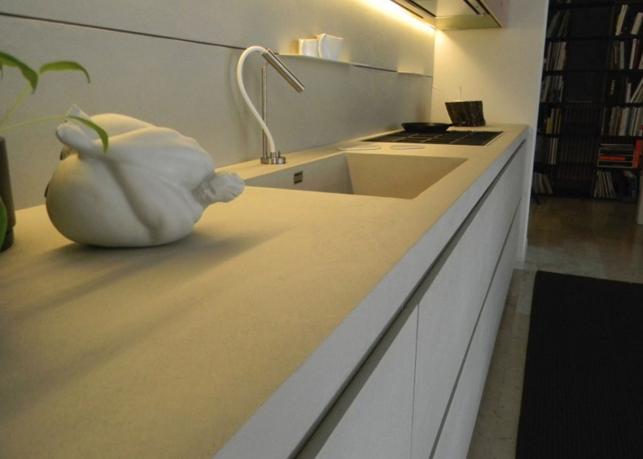 Alle Oberflächen, auch die resistentesten, kann man zerkratzen. Denken Sie an Stahl (etwa die Karosserie eines Autos oder die Küchen-Geräte), der mit scharfen Gegenständen zu hohem Stress ausgesetzt ist – er kann leicht verkratzen oder durch fallende Gegenstände beschädigt werden, ohne die Möglichkeit, wieder hergestelltzu werden und kann dann nur ersetzt werden… Wie für alle Oberflächen sind Kratzer deutlicher auf sehr glatten Oberflächen zu sehen. Aus diesem Grunde empfehlen wir für den Boden matte Oberfläche und einen strukturellen Effekt. In jedem Fall sind die Oberflächen aus Oltremateria® teilweise oder vollständig wiederherstellbar, besser als andere Materialien wie Keramik, Stahl, Kunststoff, usw., wo dies unmöglich ist .. Um die zerkratzte Oberfläche wieder herzustellen, ist es möglich, außerordentliche Wartungen durchzuführen, wie im Fall von Holzoberflächen, Marmor oder Steingut.