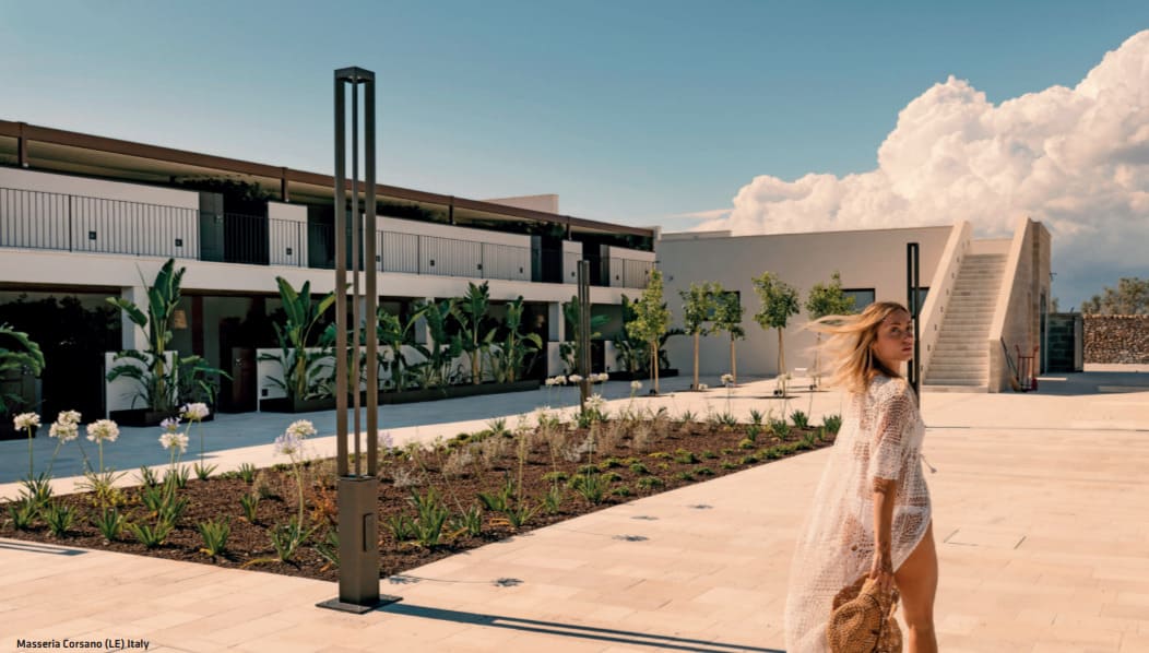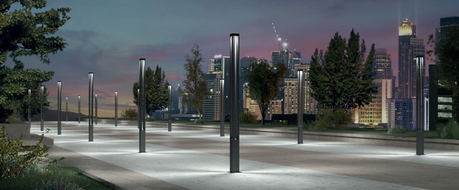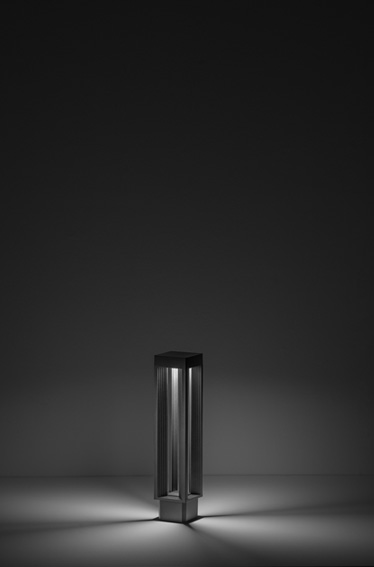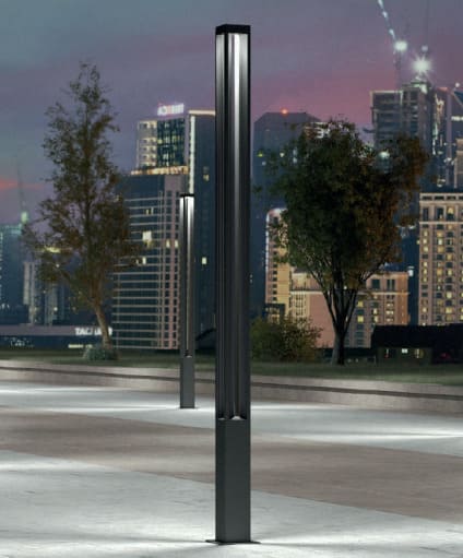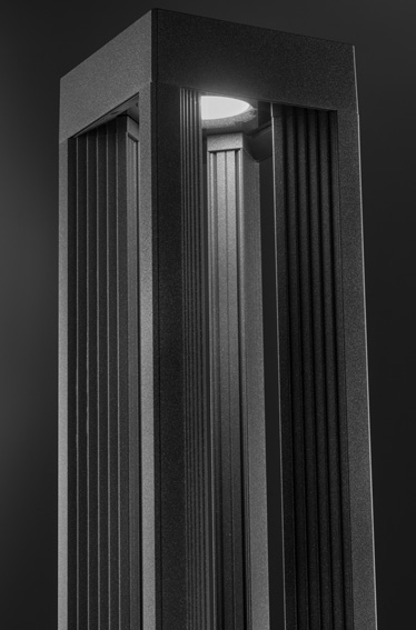 Säulenleuchte für Bodenmontage, mit Lichtquelle oben auf der Leuchte mit nach unten gerichteter Emission. Dies sorgt für eine optimale Lichtverteilung am Boden und eine bessere Kontrolle von Blendeffekten. Bodenbefestigungswinkel mit A2-Stahlklammern. Stromversorgung mit integriertem Treiber mit festem oder dimmbarem Ausgang.