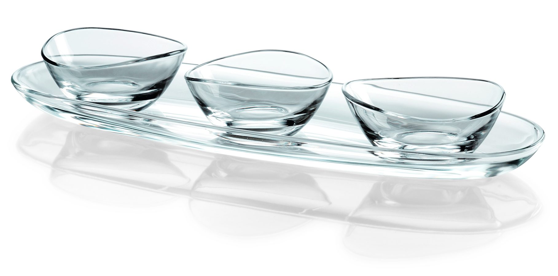 Glasartikel bestehend aus drei Schalen Ø 13 cm h 6,5 cm und ovalem Teller 50×16 cm.