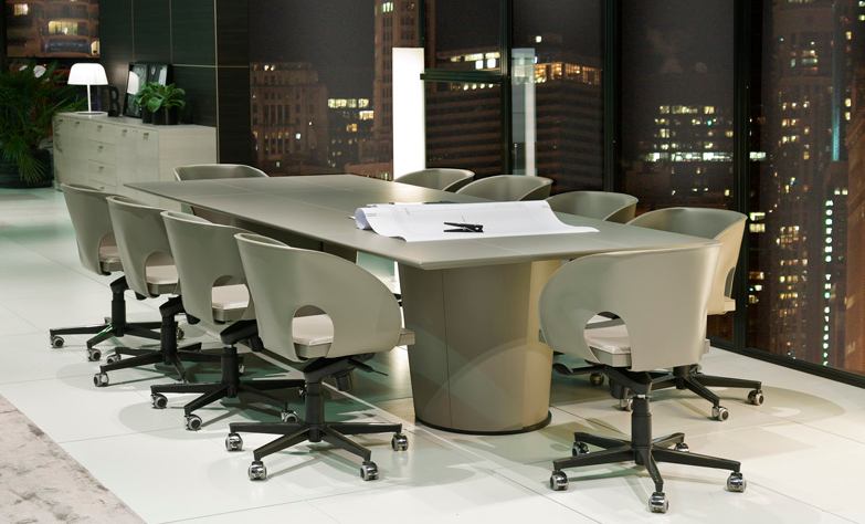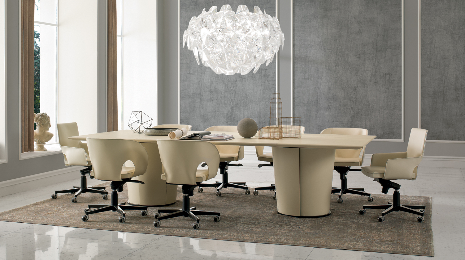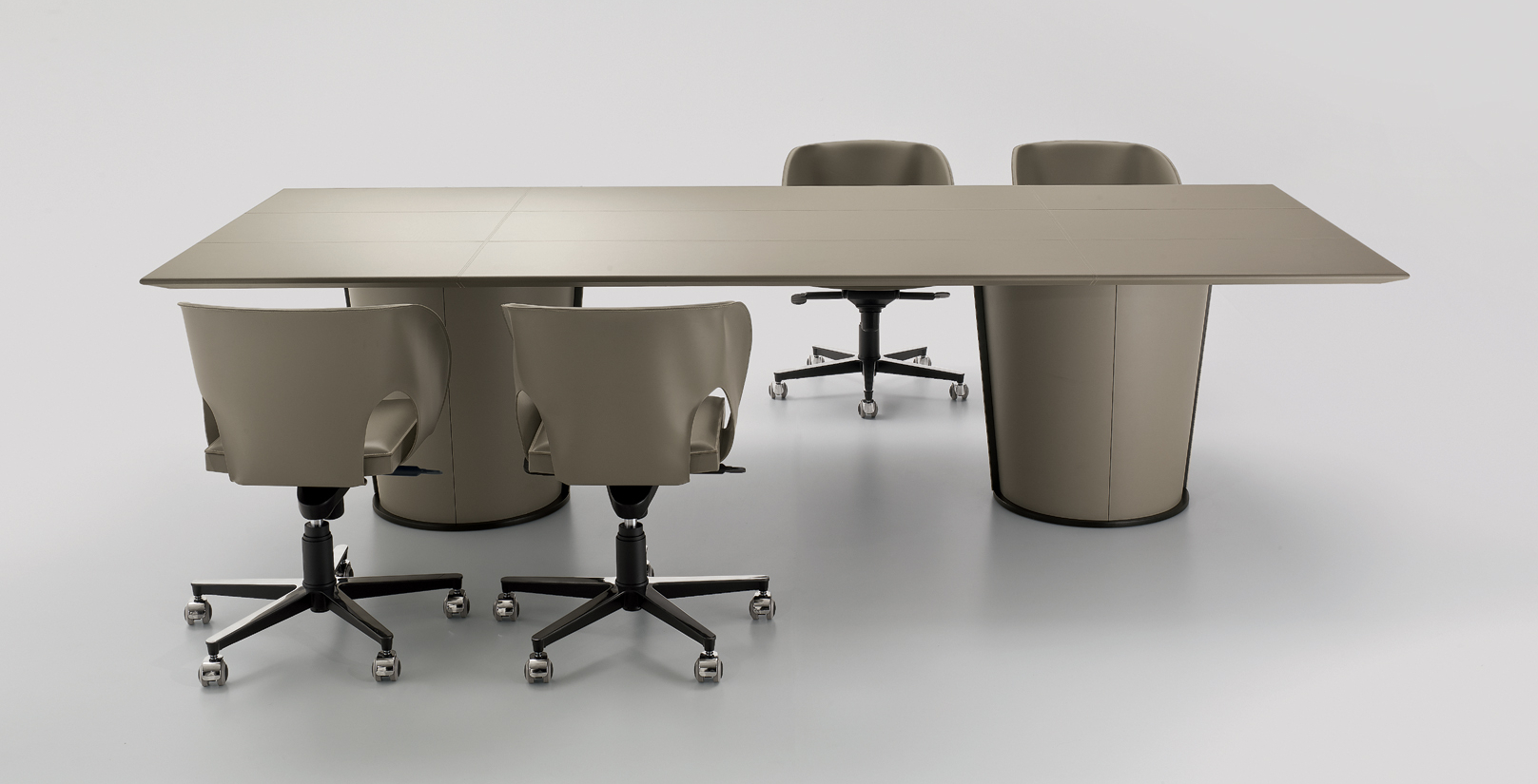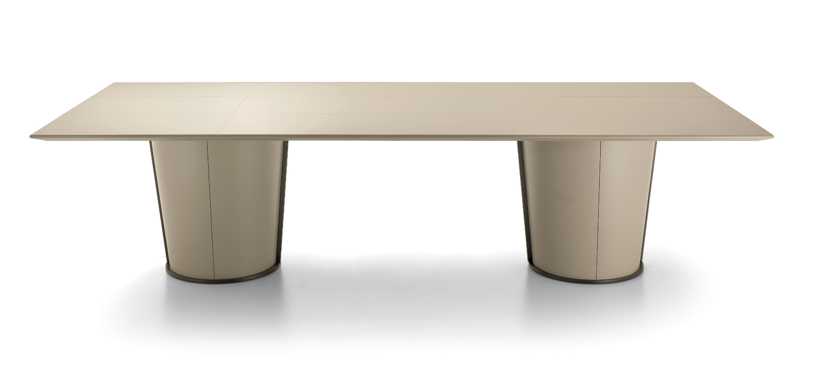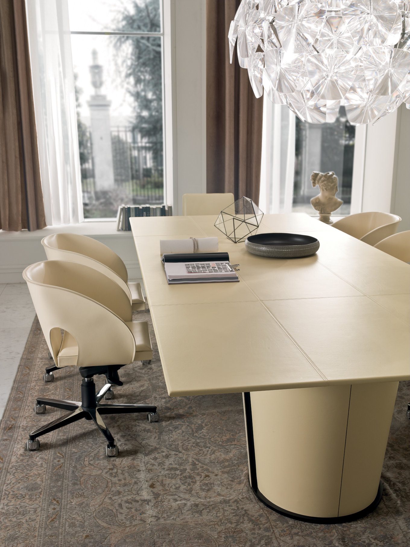 Die Tischplatte ist in runder oder quadratischer Form erhältlich, mit Verarbeitung in Calacatta Oro Marmor (oder auch in allen anderen verfügbaren Marmor Ausführungen unserer Kollektion) oder aus Spanholzplatten mit eichenähnlichem, naturbelassenem oder dunkel braunem Holz furniert. Die tragende Tischstütze besteht aus zwei runden, mit Leder verkleideten und aneinander befestigen Buchensperrholzplatten, die auf einer 10mm dicken, schwarz lackierten Stahlplatte stehen. Die Stütze ist mit der Tischplatte durch eine Unterplatte verbunden, welche aus einer melaminharzbeschichteten, schwarzen Holzplatte besteht. Der Schrank besteht aus 19mm dicken melaminharzbeschichteten Holzplatten mit Weißeichen Verarbeitung. Die Rückseite und die Türen sind einseitig mattschwarz lackiert. Die Oberseite, die Seiten und die Beine sind mit Leder überzogen. Die gebogene Klinke besteht aus schwarz lackiertem, massivem Buchenholz. Das Gestell des Stuhls besteht aus Rohrstahl, welcher in einer Form aus kalten Polyurethanschaum, mit einer Dichte von 55 kg/m³, eingetunkt wurde. Das daraus resultierende Produkt ist feuerbeständig und entspricht somit den Auflagen der italienischen Classe 1IM Brandschutzgesetze und ist, auf Nachfrage und gegen Aufpreis, auch für andere internationale Normen verfügbar. Die Stützen sind ein Stahlgestell mit vier Beinen an welche Platten aus Polyurethanschaum angeklebt sind.