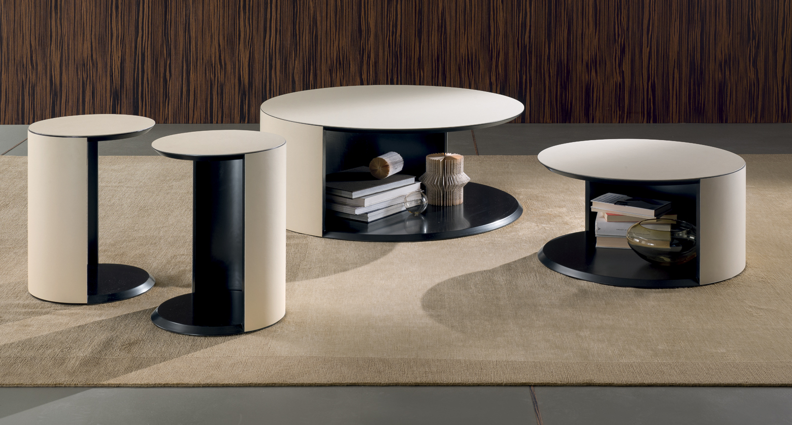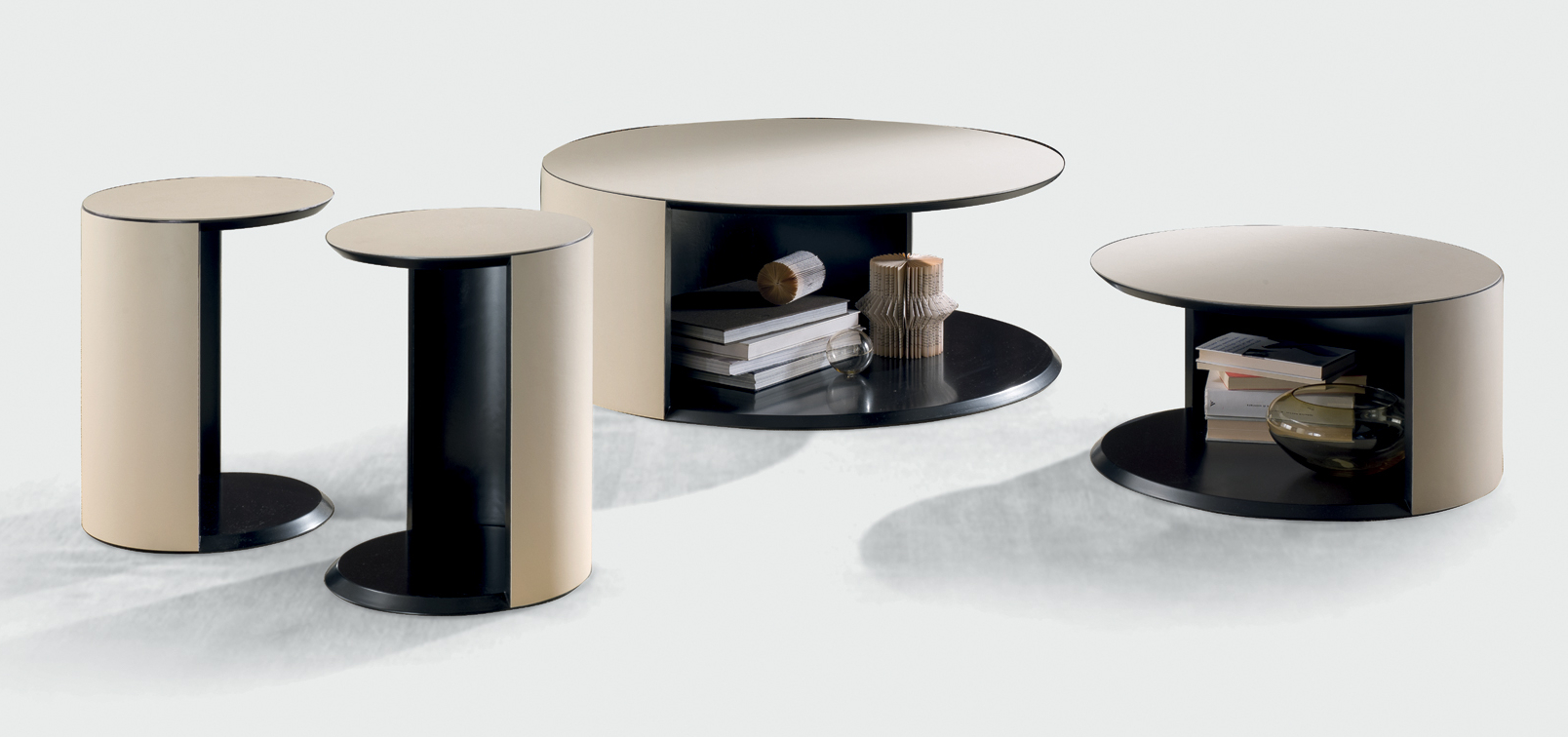Die Tischplatte ist in runder oder quadratischer Form erhältlich, mit Verarbeitung in Calacatta Oro Marmor (oder auch in allen anderen verfügbaren Marmor Ausführungen unserer Kollektion) oder aus Spanholzplatten mit eichenähnlichem, naturbelassenem oder dunkel braunem Holz furniert. Die tragende Tischstütze besteht aus zwei runden, mit Leder verkleideten und aneinander befestigen Buchensperrholzplatten, die auf einer 10mm dicken, schwarz lackierten Stahlplatte stehen. Die Stütze ist mit der Tischplatte durch eine Unterplatte verbunden, welche aus einer melaminharzbeschichteten, schwarzen Holzplatte besteht. Der Schrank besteht aus 19mm dicken melaminharzbeschichteten Holzplatten mit Weißeichen Verarbeitung. Die Rückseite und die Türen sind einseitig mattschwarz lackiert. Die Oberseite, die Seiten und die Beine sind mit Leder überzogen. Die gebogene Klinke besteht aus schwarz lackiertem, massivem Buchenholz. Das Gestell des Stuhls besteht aus Rohrstahl, welcher in einer Form aus kalten Polyurethanschaum, mit einer Dichte von 55 kg/m³, eingetunkt wurde. Das daraus resultierende Produkt ist feuerbeständig und entspricht somit den Auflagen der italienischen Classe 1IM Brandschutzgesetze und ist, auf Nachfrage und gegen Aufpreis, auch für andere internationale Normen verfügbar. Die Stützen sind ein Stahlgestell mit vier Beinen an welche Platten aus Polyurethanschaum angeklebt sind.