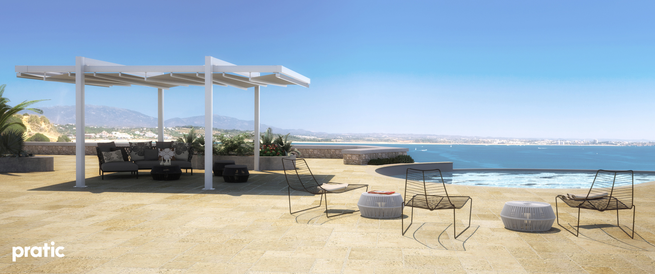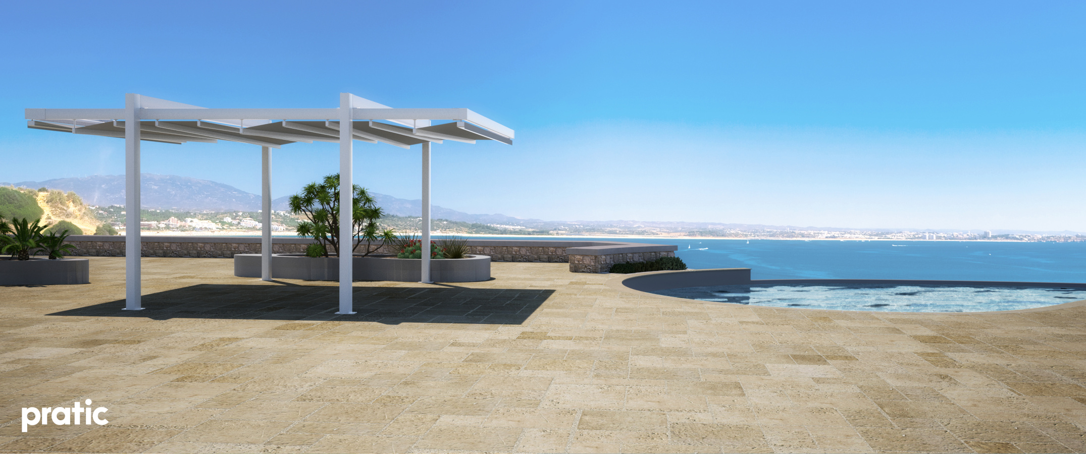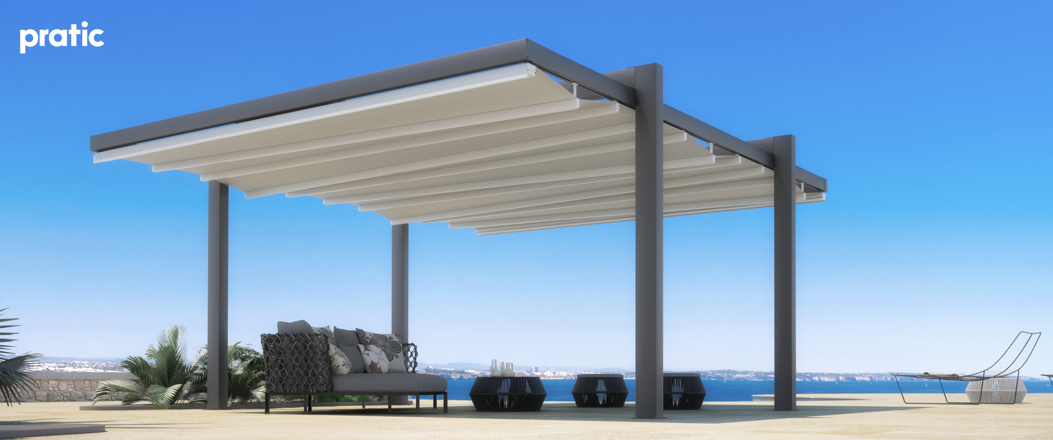 Selbsttragende, völlig aus Aluminium hergestellte Pergola mit Tecnic Tuch.