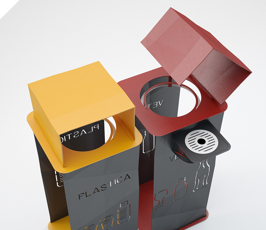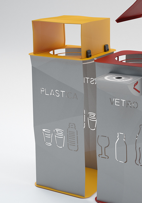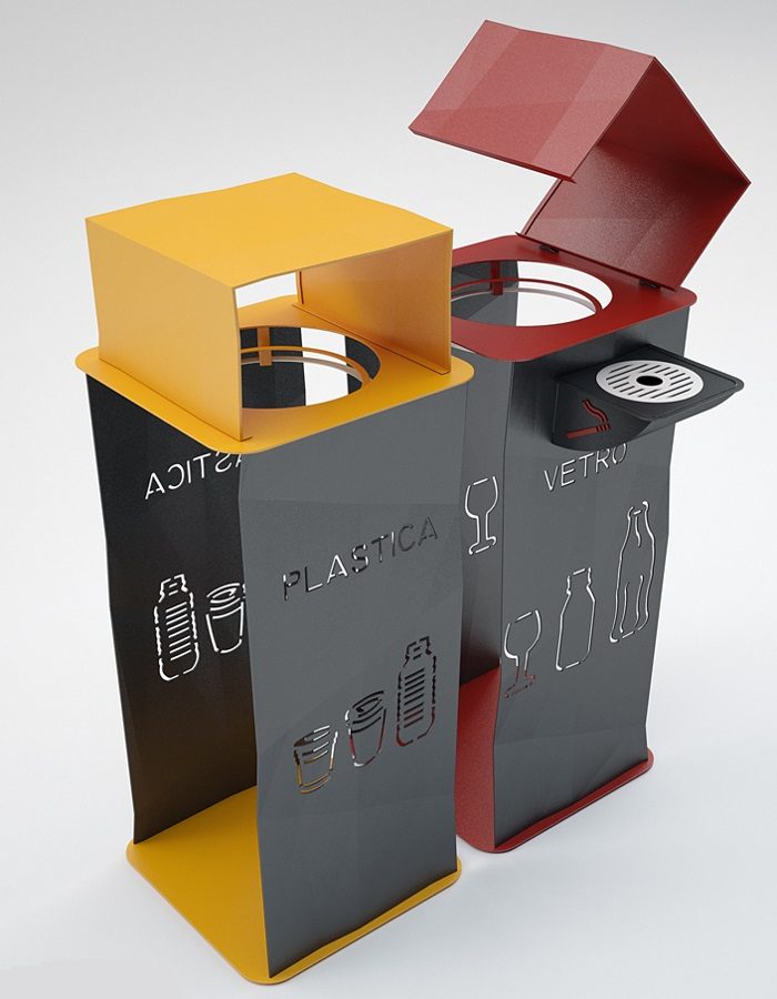 COMPOSITION: – Structure obtained from a single sheet of galvanized steel, laser cut, bent. – arranged on three sides to ensure the attachment of additional modules trash can. – On the basiC there are 2 holes (diameter 14 mm) for fixing to the ground. – The structure that contains the waste sacks is composed of a ring carrier bag, laser cut, and a locking ring bag, laser cut. – superior cover in galvanaized steel, fix on the structure with 2 hinges.