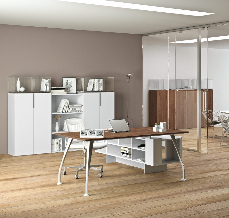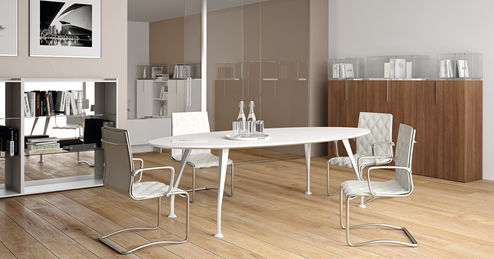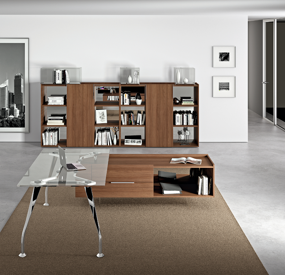Die Schreibtische aus Glas stehen rechteckig und oval zur Verfügung, bei der rechteckigen Form in drei Größen 160×90 h73 cm, 180×90 h73 und 210×90 h73, während bei der ovalen Form zwei Größen vorhanden sind 200×100 h73 cm und 250×120 h73 cm. Die aus gehärtetem Glas verwirklichten Tischplatten haben eine Stärke von 12 mm und sind in schwarzem und transparenten Glas lieferbar. Weiterhin stehen ein seitliches Verlängerungselement sowie rechteckige Servicetische aus Glas in einer einzigen Größe 90×60 h73 und runde Servicetische in den Durchmessern 100 cm, 120 cm, 135 cm, h 73 zur Verfügung. Die aus gehärtetem Glas verwirklichten Tischplatten haben eine Stärke von 12 mm und sind in schwarzem und transparenten Glas lieferbar. Die Holzschreibtische sind in rechteckiger und ovaler Form verfügbar, bei der rechteckigen Form in 3 Größen 160×90 h74 cm, 180×90 h74 und 210×90 h74 und bei der ovalen Form in zwei Größen 200×100 h74 cm und 250×120 h74 cm. Die furnierten Platten sind aus Holzagglomerat in der Stärke 35 mm verwirklicht und mit wertvollen Materialien in Holzausführung in den Farben Wengè, Sommereiche hell und Nussbaum verkleidet und bekantet. Die Seitenverlängerung und die Servicetische aus Holz sind rechteckig und haben eine einzige Größe 90×60 h74, die runden Servicetische stehen mit dem Durchmesser 100 cm und 120 cm zur Verfügung.