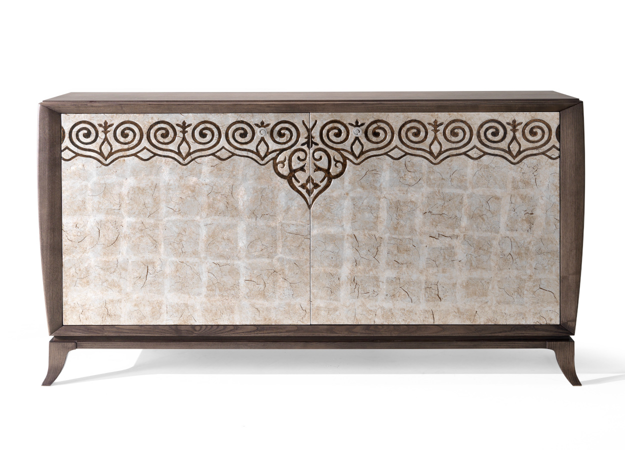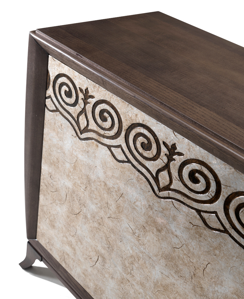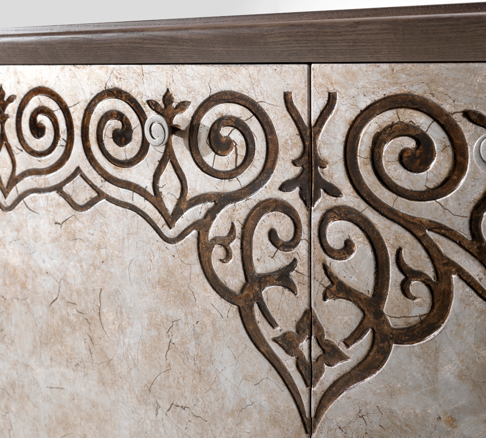 Dekorationen: Die Dekorationen auf den Kommoden der Kommode oder an den Türen der Sideboards werden von Hand bemalt und laden wertvolle Möbel mit wertvollen Details ein. Möbel, die das Handwerk auf den ersten Blick genießen lassen. Das Silberblatt und das Goldblatt in den Schnitzereien vervollständigen die Eleganz des lackierten Möbels.