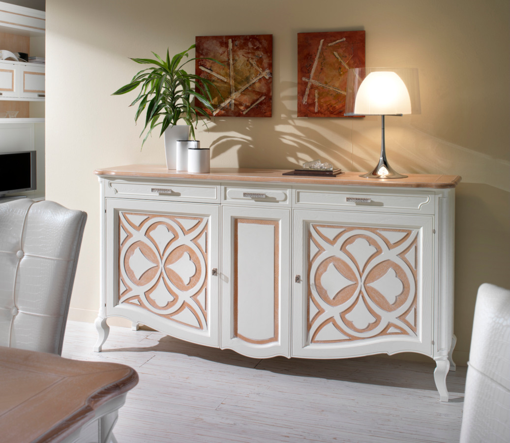 Dekorationen: Die Dekorationen auf den Kommoden der Kommode oder an den Türen der Sideboards werden von Hand bemalt und laden wertvolle Möbel mit wertvollen Details ein. Möbel, die das Handwerk auf den ersten Blick genießen lassen. Das Silberblatt und das Goldblatt in den Schnitzereien vervollständigen die Eleganz des lackierten Möbels.