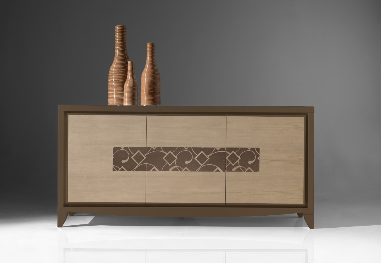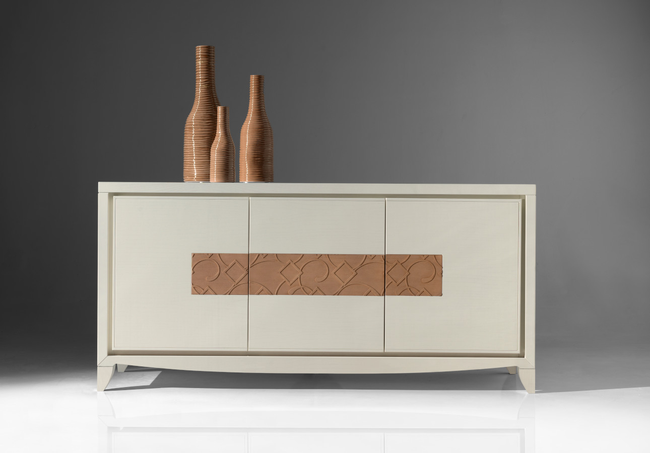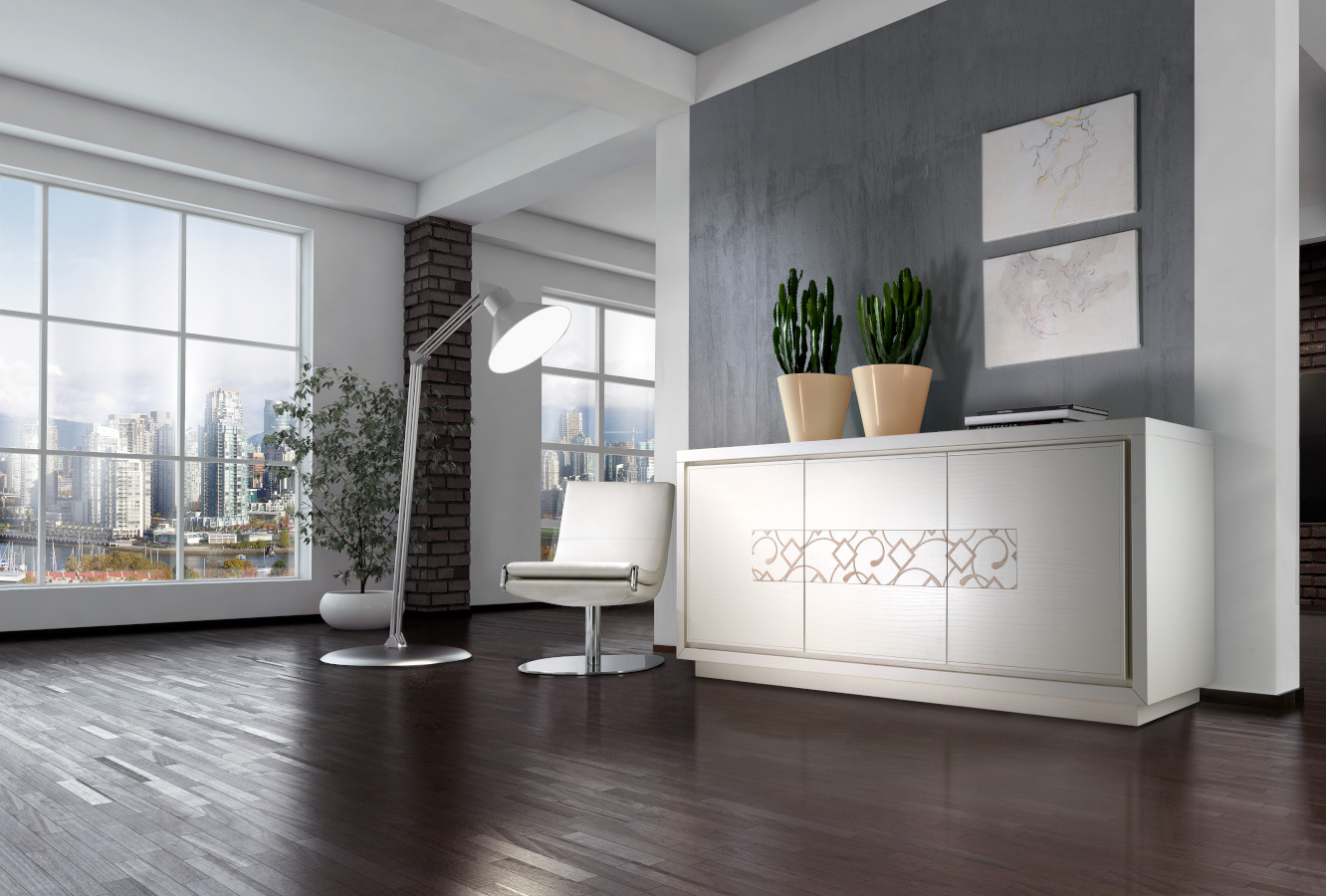 Dekorationen: Die Dekorationen auf den Kommoden der Kommode oder an den Türen der Sideboards werden von Hand bemalt und laden wertvolle Möbel mit wertvollen Details ein. Möbel, die das Handwerk auf den ersten Blick genießen lassen. Das Silberblatt und das Goldblatt in den Schnitzereien vervollständigen die Eleganz des lackierten Möbels.