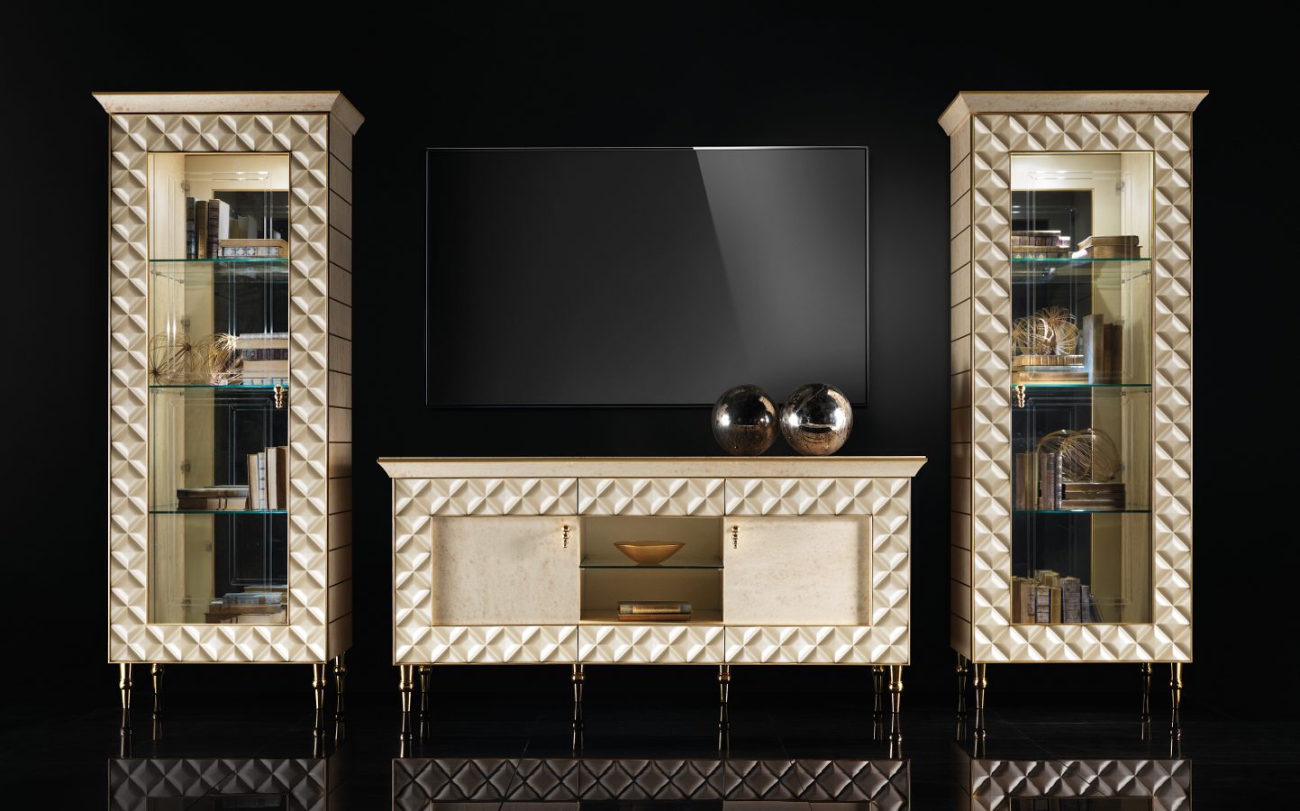 Ein helles Wohnzimmer ist der perfekte Ort, um Zeit mit Familie oder Gästen zu verbringen. Sipario ist der ideale Ort, um eine gesellige, entspannte und gleichzeitig elegante Atmosphäre zu schaffen. Der Wohnzimmerbereich von Sipario entwickelt eines der dekorativen Themen der Kollektion vollständig: die Verwendung von Rautenrahmen. Die Rahmen in Sipario sind eines der Hauptelemente, um die sich das Design der gesamten Kollektion entwickelt. Rahmen, die als modulares Element zum Entwerfen und Ausbalancieren von Volumen verwendet werden, Rauten als raffinierte und elegante dekorative Systeme. Die Rahmen enthalten auch eine der interessantesten Neuheiten der Sammlung, den künstlerischen Einsatz hochtechnologischer Materialien. In Sipario wird zum ersten Mal ein Vorhang verwendet, der bei gleicher Haltbarkeit wie herkömmliche Materialien Es hat eine Besonderheit, die die Welt der Tradition der des Designs noch näher bringt: Bei Berührung erinnert es an die Konsistenz der Seide. Eine Lösung, die Innovation, Tradition und Kreativität glücklich verbindet.