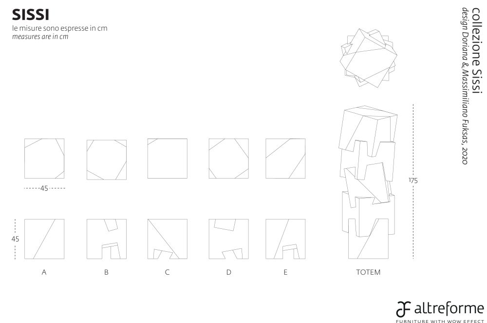 Design: Doriana & Massimiliano Fuksas Totem oder Möbelstuck ? Sie wählen: Sissi ist ein Made-in-Italy Möbeljuwel, ein ökologisches und umweltfreundliches Produkt (100% aus Aluminium). Es kann sowohl ein einziger Hocker als auch eine fünf-Elemente modulare Sitzung sein, die an eine totem Skulptur erinnert. Für die Totemzusammensetzung braucht man ein Element jeder Art.