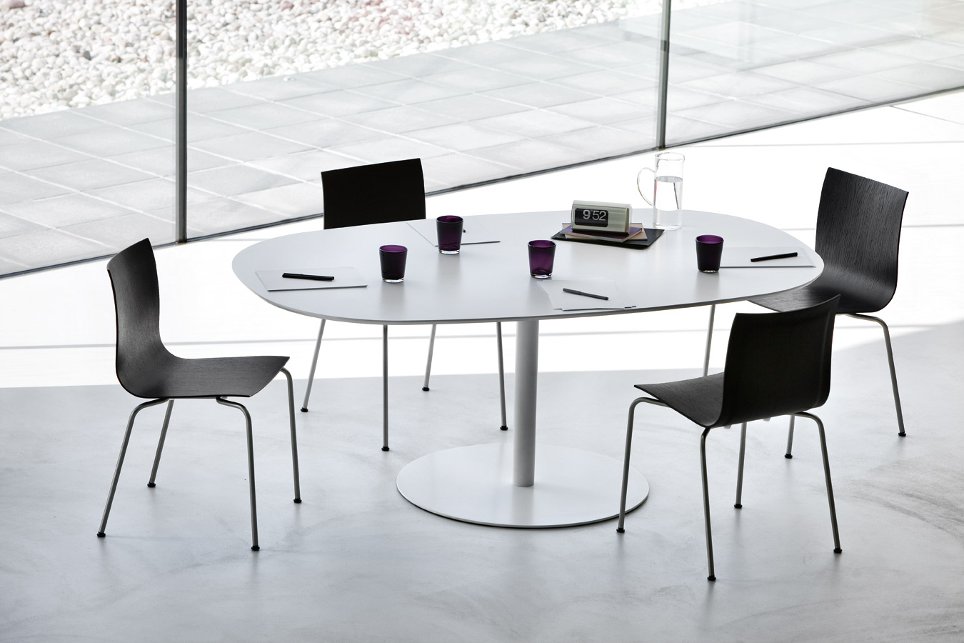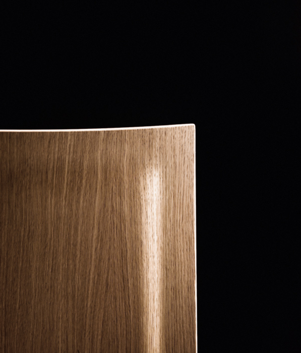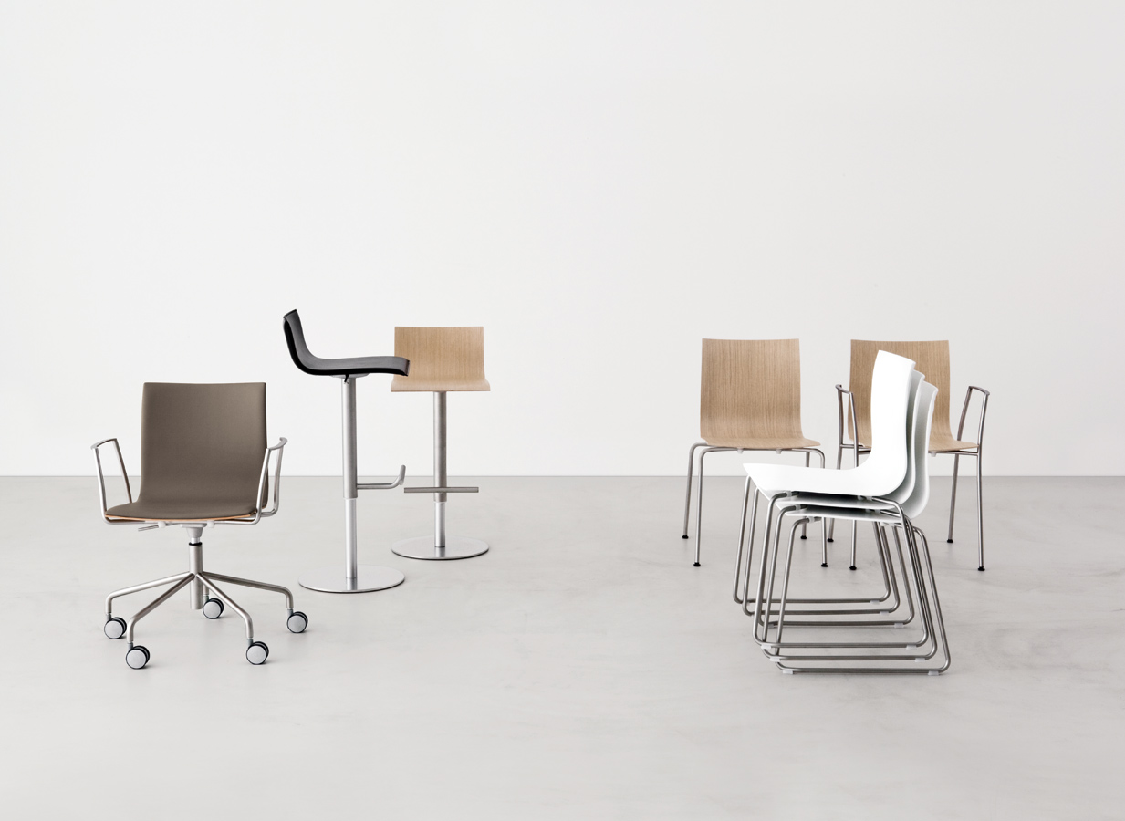 Stuhl mit oder ohne Armlehnen, auch stapelbar, mit Sitzschale aus formgepresstem Multiplex mit unterschiedlicher Materialstärke und verschiedenen Gestelltypen in sandgestrahltem Edelstahl Aisi 304: Vierbein- oder Schlittengestell, zentrale, höhenverstellbare Säule mit Rollen.