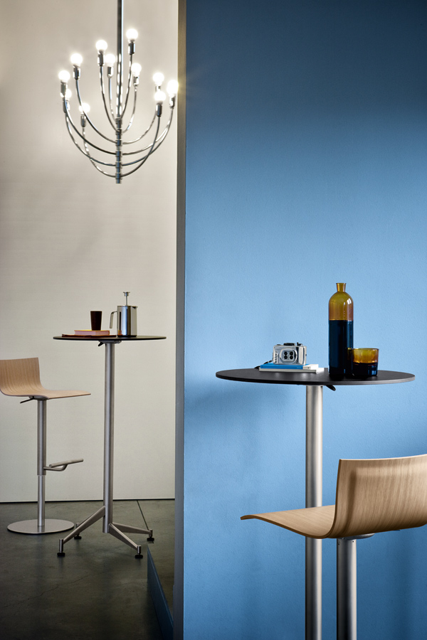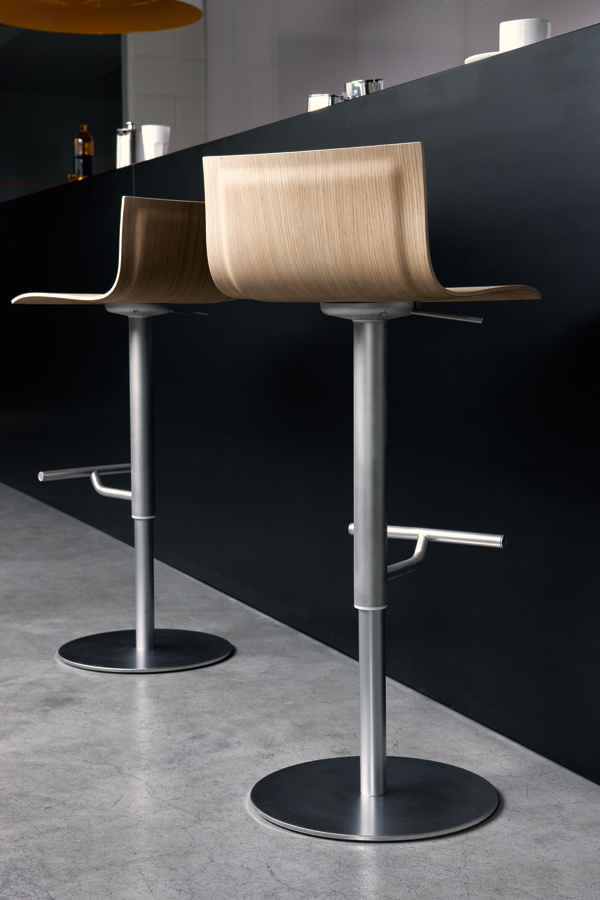 Die Produktgruppe wird erweitert durch einen drehbaren Hocker mit Höhenverstellung durch Gasdruckfeder und Gestell in sandgestrahltem Edelstahl Aisi 304 und mit Bodenplatte aus Edelstahl mit „Leinenstruktur“.