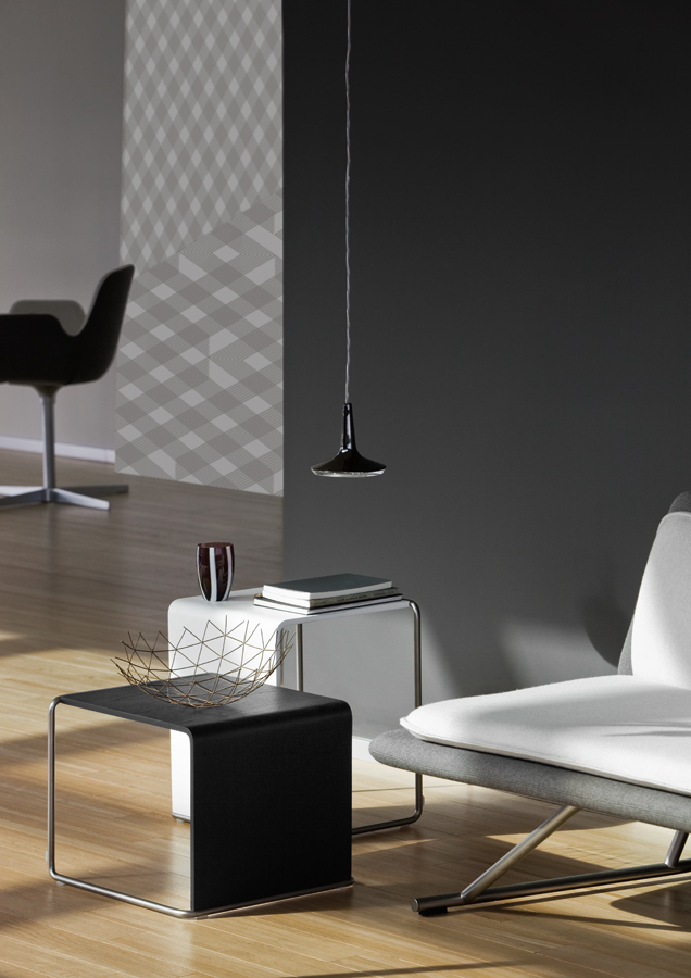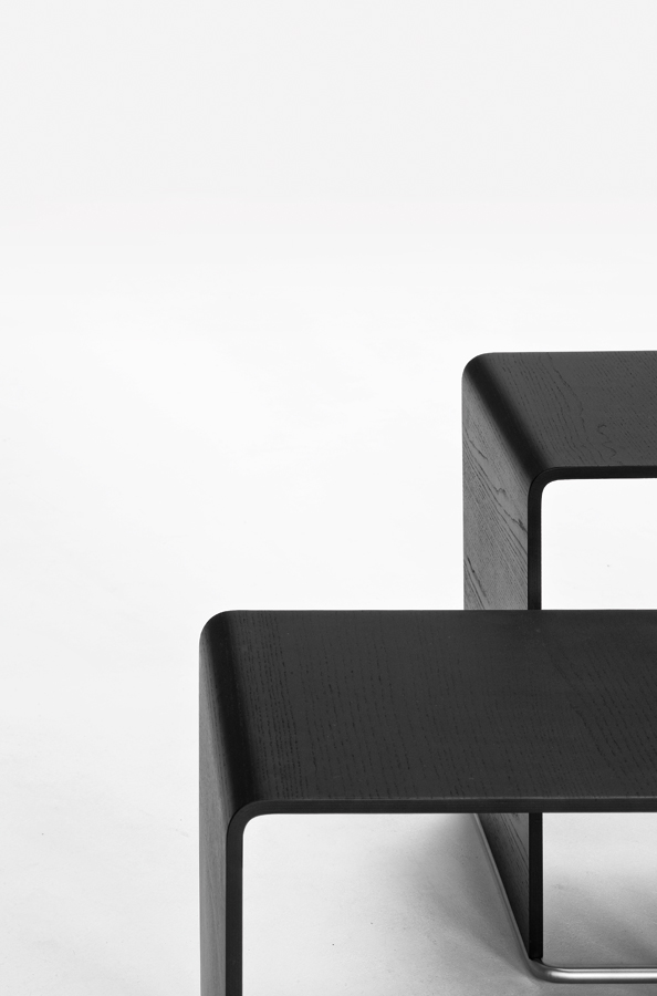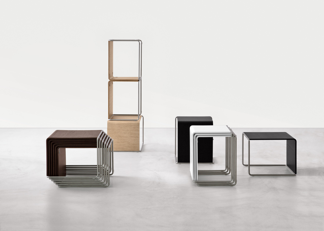 Stapelbarer Couchtisch-Hocker mit Gestell aus sandgestrahltem Edelstahl Aisi 304 und Tischplatte/Sitz in Multiplex in verschiedenen Ausführungen.