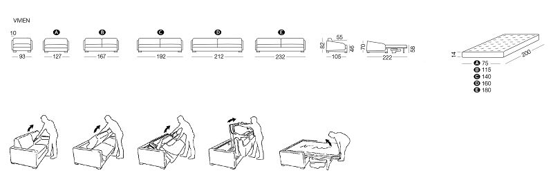 Die Metallfüße sind aus schwarzen Nickel gefertigt. Durch einfache Rotation des Rückenteils und ohne ein Kissen zu entfernen, verwandelt sich Vivien in ein richtiges Bett mit einem 200 cm Matratze; der Bezug ist komplett abnehmbar und je nach Stoffwahl auch waschbar.