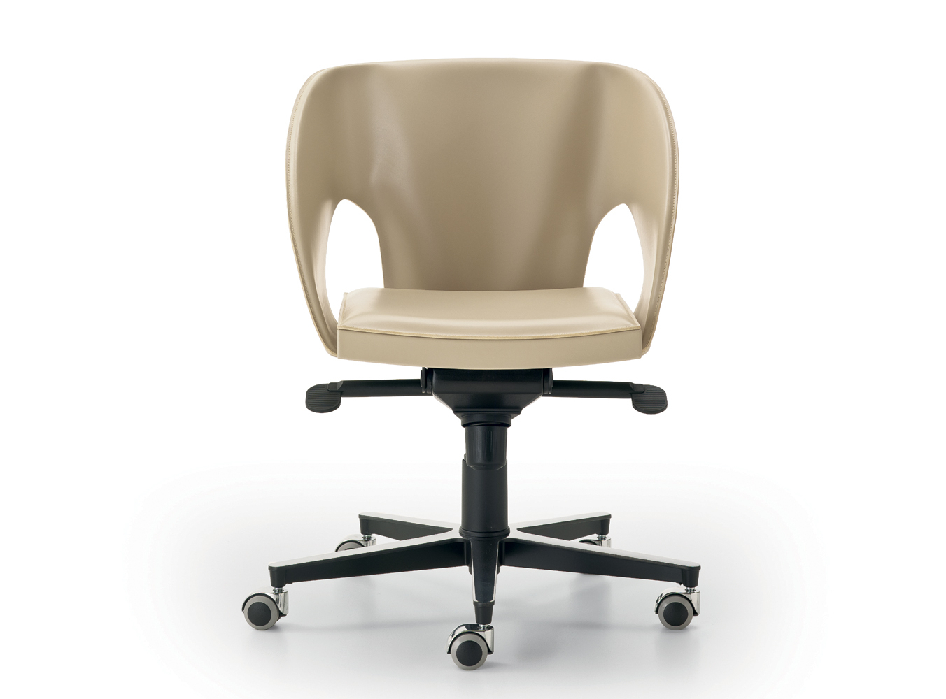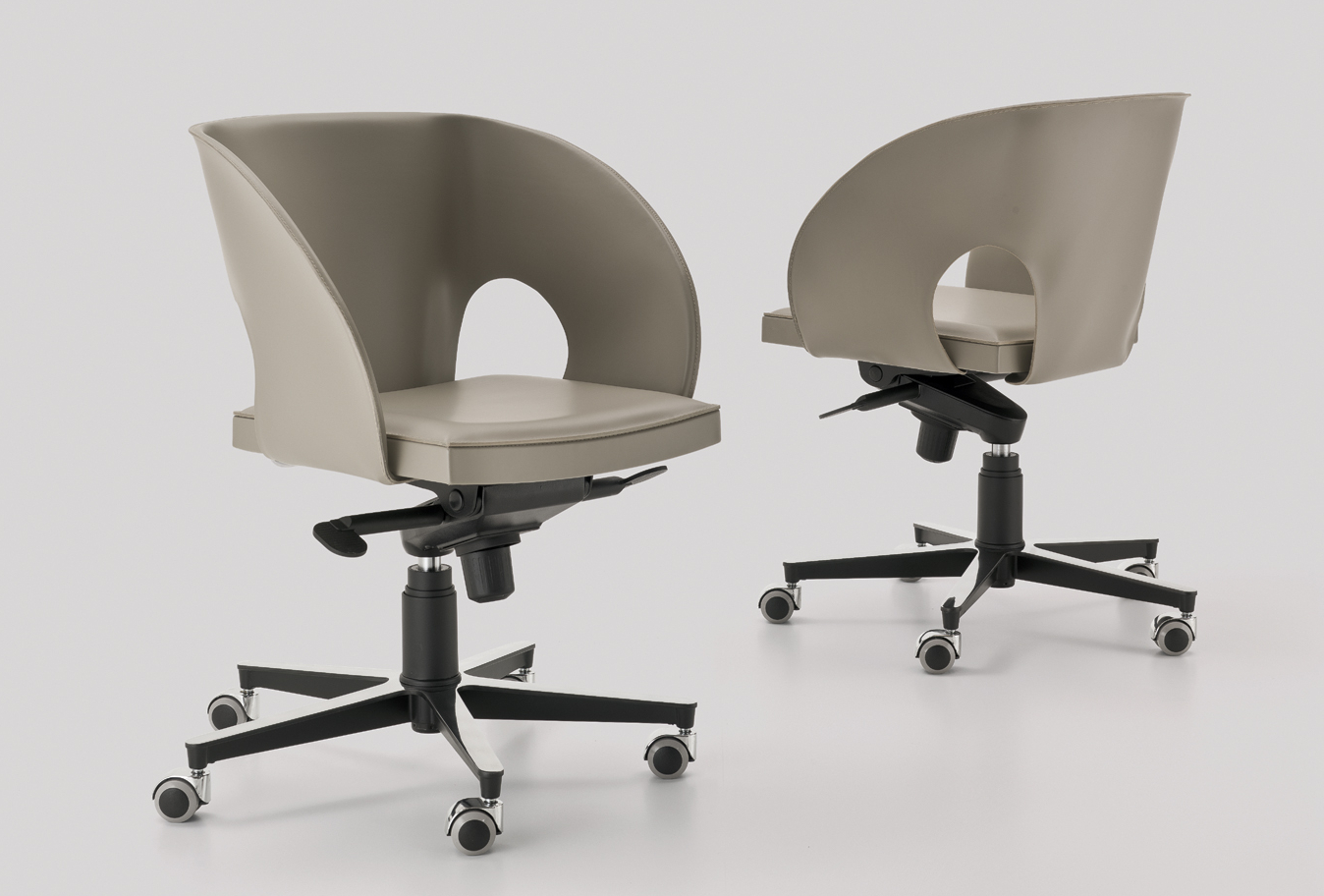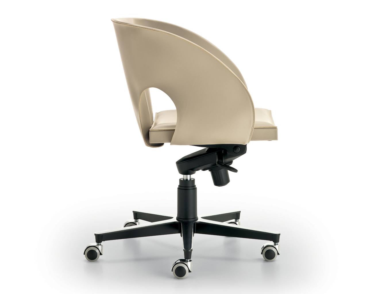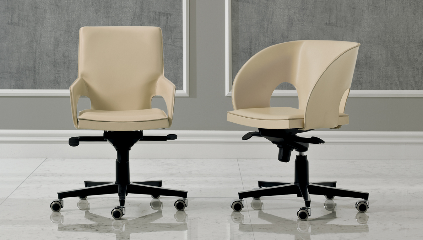 In der Bueroversion der Sitz in Quadratabschnitt roehrenformiger Stahl bedeckt in Rindleder befestigt zu einer Gestell mit 5 Speichen, hohenverstellbar durch Gasfeder und Wippmechanick.