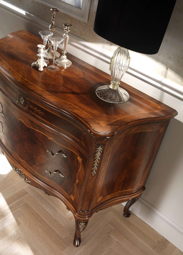 Wahl des Holzes: Es werden unterschiedliche Essenzen verwendet, die jeweils die Einrichtungselemente aufwerten, die durch bestimmte Inlays und Schnitzereien bereichert werden. Die Verwendung von Massivholz erster Qualität gewährleistet über die Jahre eine spürbare Qualität und Haltbarkeit.