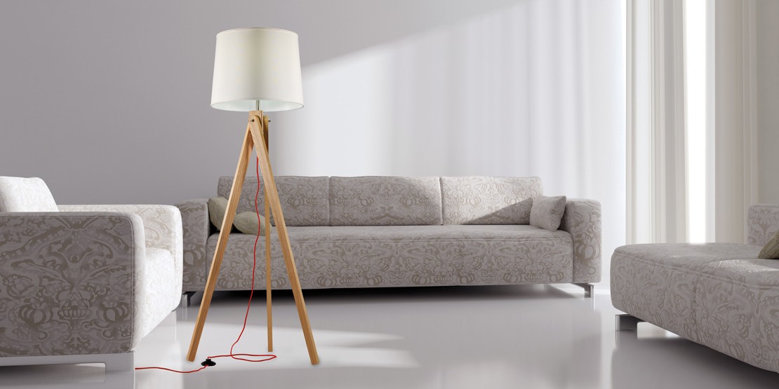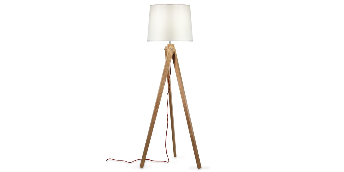 Stehlampe. Schirm aus Stoff oder Kunstleder. Gestell aus natürlichem Holz. Für Lampen mit E27 Anschluss oder ähnliche LED-Lampen. Für diffuse Lichteffekte. Textilkabel braun oder Weiß Max Länge 200 cm.. Ein-/Ausschaltpedal.
